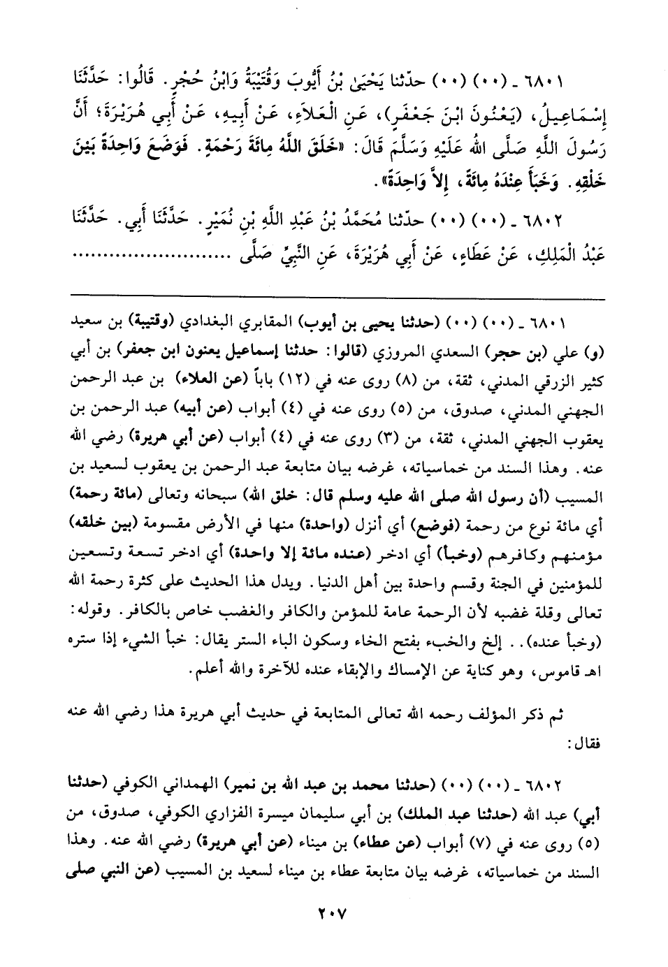 ٦٨٠١ - (٠٠) (٠٠) (حدثنا يحيى بن أَيُّوب) المقابري البغدادي (وقتيبة) بن سعيد (و) علي (بن حجر) السعدي المروزي (قالوا: حَدَّثَنَا إسماعيل يعنون ابن جعفر) بن أبي كثير الزُّرَقيّ المدنِيُّ، ثِقَة، من (٨) روى عنه في (١٢) بابًا (عن العلاء) بن عبد الرَّحْمَن الجهني المدنِيُّ، صدوق، من (٥) روى عنه في (٤) أبواب (عن أَبيه) عبد الرَّحْمَن بن يعقوب الجهني المدنِيُّ، ثِقَة، من (٣) روى عنه في (٤) أبواب (عن أبي هريرة) رضي الله عنه. وهذا السند من خماسياته، غرضه بيان متابعة عبد الرَّحْمَن بن يعقوب لسعيد بن المسيّب (أن رسول الله صلى الله عليه وسلم قال: خلق الله) سبحانه وتعالى (مائة رحمة) أي مائة نوع من رحمة (فوضع) أي أنزل (واحدة) منها في الأرض مقسومة (بين خلقه) مؤمنهم وكافرهم (وخبأ) أي ادخر (عنده مائة إلَّا واحدة) أي ادخر تسعة وتسعين للمؤمنين في الجنة وقسم واحدة بين أهل الدنيا. ويدل هذا الحديث على كثرة رحمة الله تعالى وقلة غضبه لأن الرحمة عامة للمؤمن والكافر والغضب خاص بالكافر. وقوله: (وخبأ عنده) .. إلخ والخبء بفتح الخاء وسكون الباء الستر يقال: خبأ الشيء إذا ستره اه قاموس، وهو كناية عن الإمساك والإبقاء عنده للآخرة والله أعلم.