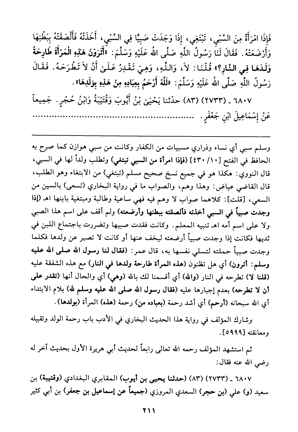 فَإِذَا امْرَأَةٌ مِنَ السَّبْيِ، تَبْتَغِي، إِذَا وَجَدَتْ صَبِيًّا في السَّبْي، أَخَذَتْهُ فَأَلْصَقَتْهُ بِبَطْنِهَا وَأَرْضَعَتهُ. فَقَالَ لَنَا رَسُولُ اللهِ صَلَّى الله عَلَيهِ وَسَلَّمَ: "أترَوْنَ هذِهِ الْمَرْأَةَ طَارِحَةً وَلَدَهَا في النَّارِ؟ " قُلْنَا: لا، وَاللهِ، وَهِيَ تَقْدِرُ عَلَى أنْ لا تَطْرَحَهُ. فَقَالَ رَسُولُ اللهِ صَلَّى الله عَلَيْهِ وَسَلَّمَ: "لَلهُ أَرْحَمُ بِعِبَادِهِ من هَذِهِ بِوَلَدِهَا".