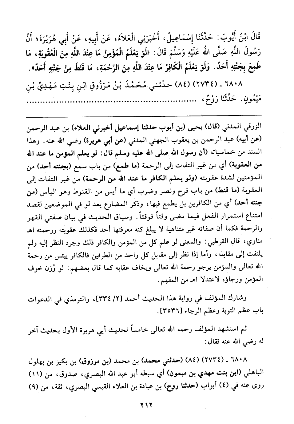 قَالَ ابْنُ أيُّوبَ: حَدَّثَنَا إِسْمَاعِيلُ، أَخْبَرَنِي الْعَلَاءُ، عَنْ أَبِيهِ، عَنْ أَبِي هُرَيْرَةَ؛ أَنَّ رَسُولَ اللهِ صَلَّى الله عَلَيْهِ وسَلَّمَ قَالَ: "لَوْ يَعْلَمُ الْمُؤْمِنُ مَا عِنْدَ الله مِنَ الْعُقُوبَةِ، مَا طَمِعَ بِجَنَّتِهِ أَحَدٌ. وَلَوْ يَعْلَمُ الْكَافِرُ مَا عِنْدَ اللهِ مِنَ الرَّحْمَةِ، مَا قَنَطَ مِنْ جَنَّتِهِ أَحَدٌ".