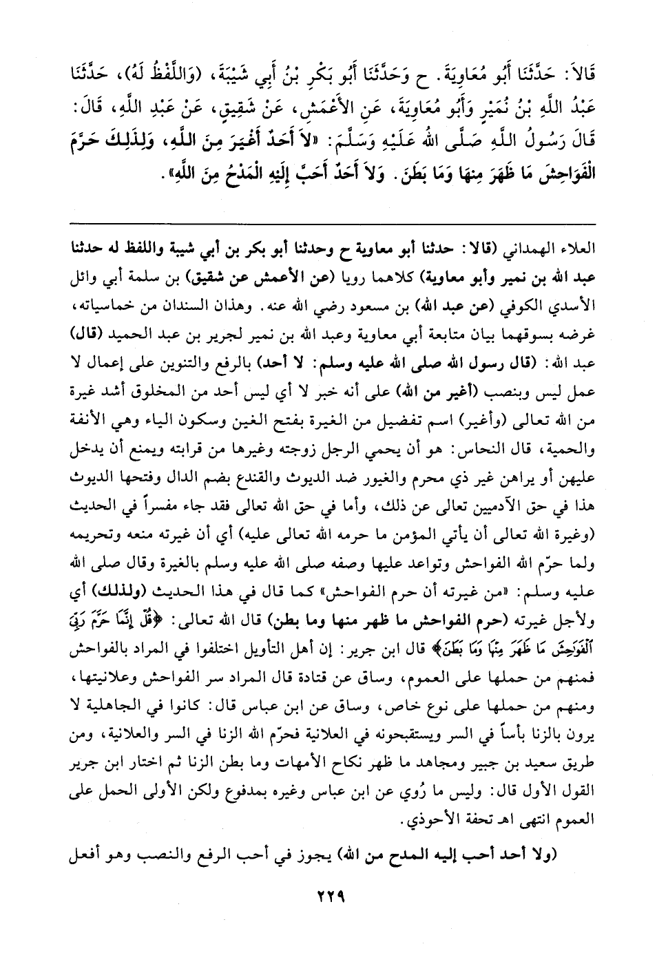 قَالَا: حَدَّثَنَا أَبُو مُعَاوِيةَ. ح وَحَدَّثَنَا أَبُو بَكْرِ بْنُ أَبِي شَيبَةَ، (وَاللَّفْظُ لَهُ)، حَدَّثَنَا عَبْدُ اللهِ بْنُ نُمَيْرٍ وَأَبُو مُعَاوَيةَ، عَنِ الأَعْمَشِ، عَنْ شَقِيقٍ، عَنْ عَبْدِ اللهِ، قَالَ: قَالَ رَسُولُ اللهِ صَلَّى الله عَلَيْهِ وَسَلَّمَ: "لَا أَحَدٌ أَغْيَرَ مِنَ اللهِ، وَلِذَلِكَ حَرَّمَ الْفَوَاحِشَ مَا ظَهَرَ مِنهَا وَمَا بَطَنَ. وَلَا أحدٌ أَحَبَّ إِلَيهِ الْمَدْحُ مِنَ اللهِ"