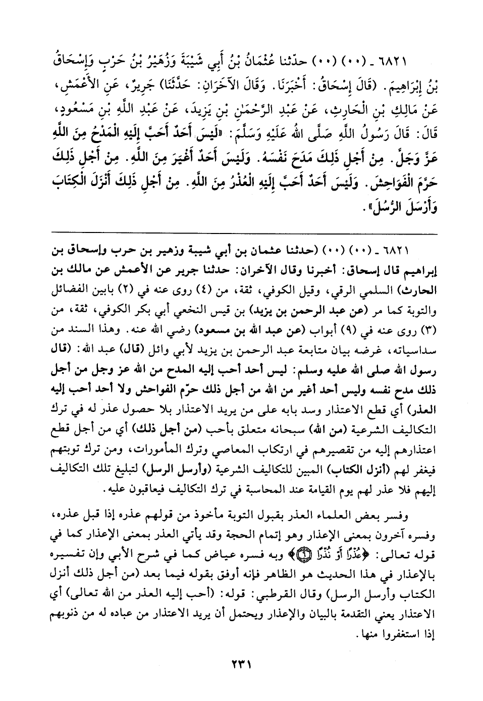 ٦٨٢١ - (٠٠) (٠٠) حَدَّثَنَا عُثْمَانُ بْنُ أَبِي شَيْبَةَ وَزُهَيْرُ بْنُ حَرْبٍ وَإِسْحَاقُ بْنُ إِبْرَاهِيمَ. (قَالَ إِسْحَاقُ: أَخْبَرَنَا. وَقَالَ الآخَرَانِ: حَدَّثَنَا) جَرِيرٌ، عَنِ الأَعْمَشِ، عَنْ مَالِكٍ بْنِ الْحَارِثِ، عَنْ عَبْدِ الرَّحْمَنِ بْنِ يَزِيدَ، عَنْ عَبْدِ اللهِ بْنِ مَسْعُودٍ، قَالَ: قَالَ رَسُولُ اللهِ صَلَّى الله عَلَيْهِ وَسَلَّمَ: "لَيسَ أَحَدٌ أَحَبَّ إِلَيهِ الْمَدْحُ مِنَ اللهِ عَزَّ وَجَلَّ. مِنْ أَجْلِ ذَلِكَ مَدَحَ نَفْسَهُ. وَلَيسَ أَحَدٌ أَغْيَرَ مِنَ اللهِ. مِنْ أَجْلِ ذَلِكَ حَرَّمَ الْفَوَاحِشَ. وَلَيْسَ أَحَدٌ أَحَبَّ إِلَيهِ الْعُذْرُ مِنَ اللهِ. مِنْ أَجْلِ ذَلِكَ أَنْزَلَ الْكِتَابَ وَأَرْسَلَ الرُّسُلَ"