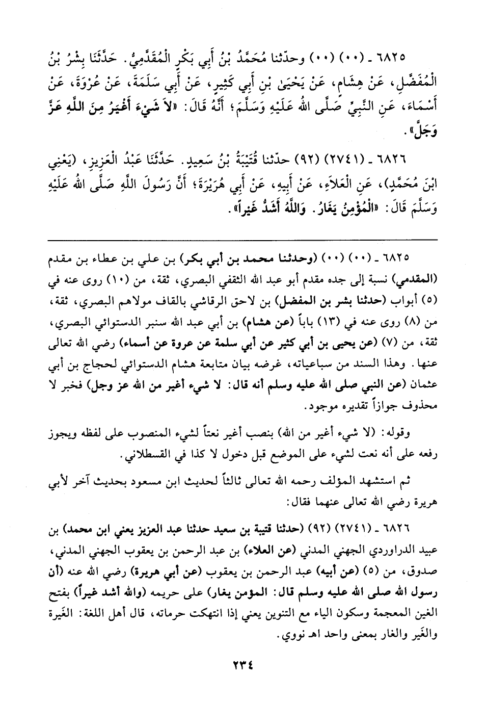 ٦٨٢٥ - (٠٠) (٠٠) (وحدثنا مُحَمَّد بن أبي بكر) بن عليّ بن عطاء بن مقدم (المقدمي) نسبة إلى جده مقدم أبو عبد الله الثَّقَفيّ البَصْرِيّ، ثِقَة، من (١٠) روى عنه في (٥) أبواب (حَدَّثَنَا بشر بن المفضل) بن لاحق الرَّقاشيّ بالقاف مولاهم البَصْرِيّ، ثِقَة، من (٨) روى عنه في (١٣) بابًا (عن هشام) بن أبي عبد الله سنبر الدستوائي البَصْرِيّ، ثِقَة، من (٧) (عن يحيى بن أبي كثير عن أبي سلمة عن عروة عن أسماء) رضي الله تعالى عنها. وهذا السند من سباعياته، غرضه بيان متابعة هشام الدستوائي لحجاج بن أبي عثمان (عن النَّبِيّ صلى الله عليه وسلم أنَّه قال: لا شيء أغير من الله عَزَّ وَجَلَّ) فخبر لا محذوف جوازًا تقديره موجود.