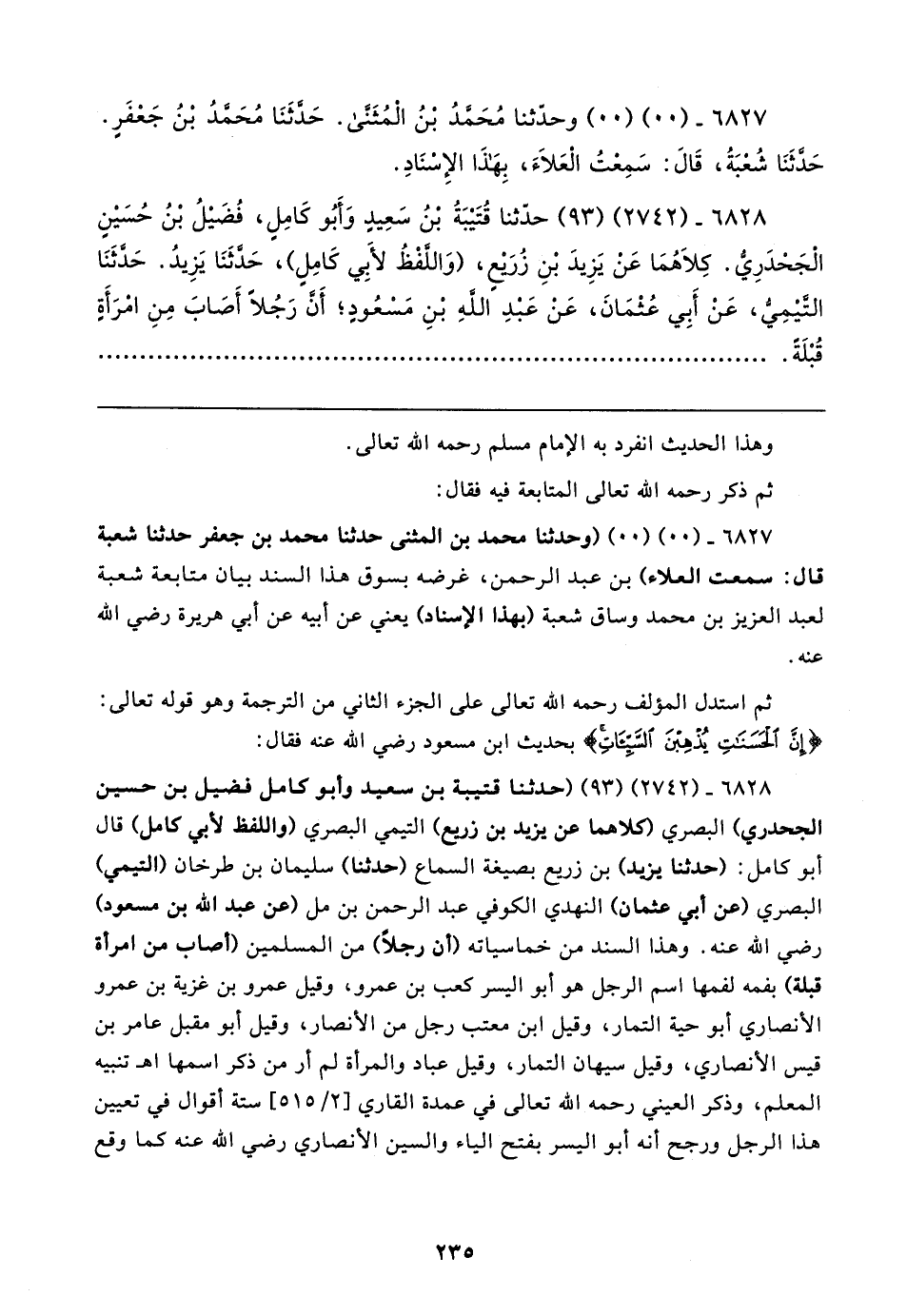 ٦٨٢٨ - (٢٧٤٢) (٩٣) حدّثنا قُتَيبَةُ بْنُ سَعِيدٍ وَأَبُو كَامِلٍ، فُضَيْلُ بْنُ حُسَيْنٍ الْجَحْدَرِيُّ. كِلَاهُمَا عَنْ يَزِيدَ بْنِ زُريعٍ، (وَاللَّفْظُ لأَبِي كَامِلٍ)، حَدَّثَنَا يَزِيدُ. حَدَّثَنَا التَّيْمِيُّ، عَنْ أَبِي عُثْمَانَ، عَنْ عَبْدِ اللهِ بْنِ مَسعودٍ؛ أَنَّ رَجُلًا أَصَابَ مِنِ امْرَأَةٍ قُبْلَةً