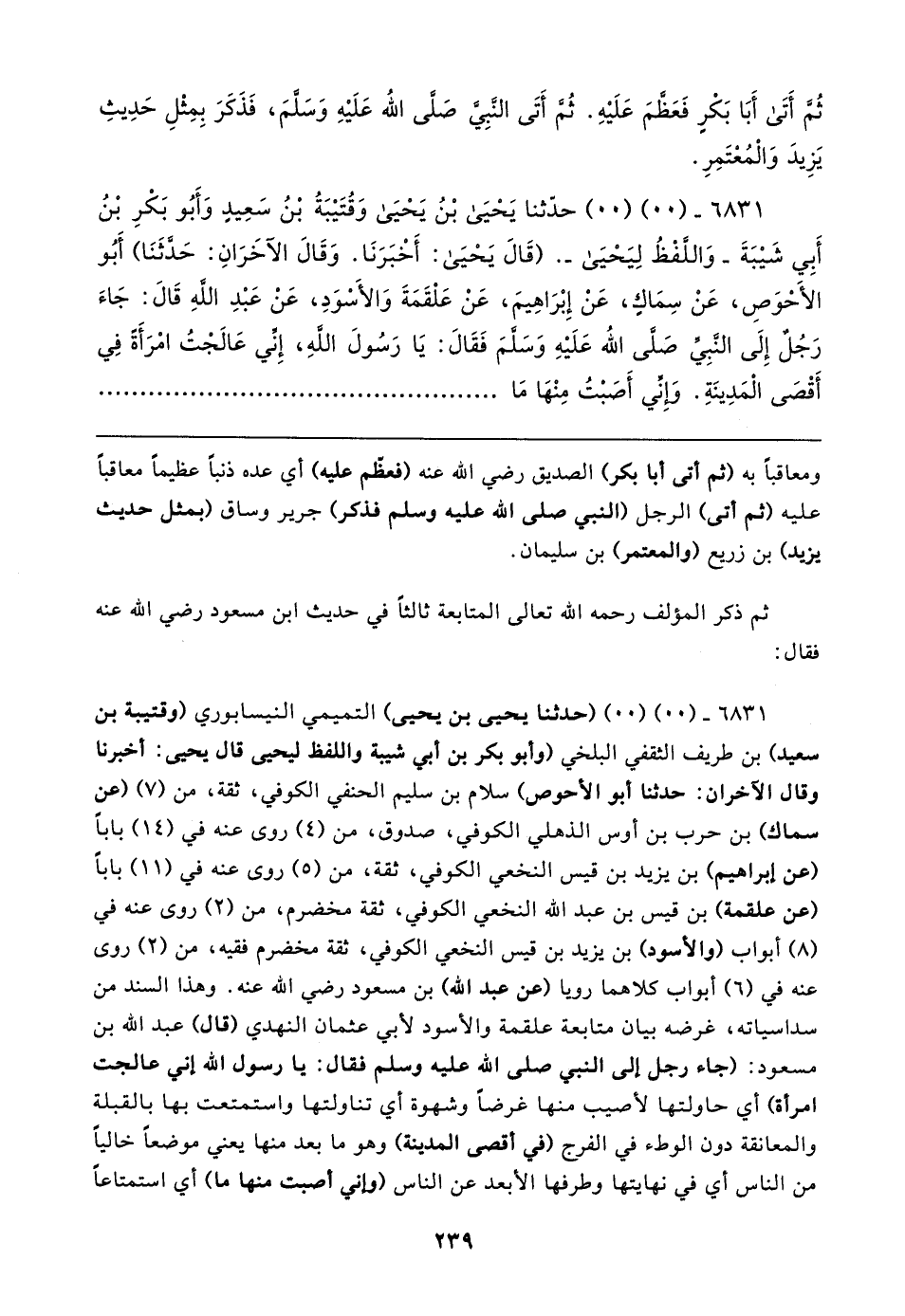 ٦٨٣١ - (٠٠) (٠٠) (حدثنا يحيى بن يحيى) التَّمِيمِيّ النَّيْسَابُورِيّ (وقتيبة بن سعيد) بن طريف الثَّقَفيّ البلخي (وأبو بكر بن أبي شيبة واللفظ ليحيى قال يحيى: أخبرنا وقال الآخران: حَدَّثَنَا أبو الأحوص) سلام بن سليم الحنفي الكُوفيّ، ثِقَة، من (٧) (عن سماك) بن حرب بن أوس الذُّهليّ الكُوفيّ، صدوق، من (٤) روى عنه في (١٤) بابًا (عن إبراهيم) بن يزيد بن قيس النَّخَعيّ الكُوفيّ، ثِقَة، من (٥) روى عنه في (١١) بابًا (عن علقمة) بن قيس بن عبد الله النَّخَعيّ الكُوفيّ، ثِقَة مخضرم، من (٢) روى عنه في (٨) أبواب (والأسود) بن يزيد بن قيس النَّخَعيّ الكُوفيّ، ثِقَة مخضرم فقيه، من (٢) روى عنه في (٦) أبواب كلاهما رويا (عن عبد الله) بن مسعود رضي الله عنه. وهذا السند من سداسياته، غرضه بيان متابعة علقمة والأسود لأبي عثمان النهدي (قال) عبد الله بن مسعود: (جاء رجل إلى النَّبِيّ صلى الله عليه وسلم فقال: يَا رسول الله إنِّي عالجت امرأة) أي حاولتها لأصيب منها غرضًا وشهوة أي تناولتها واستمتعت بها بالقبلة والمعانقة دون الوطء في الفرج في أقصى المدينة) وهو ما بعد منها يعني موضعًا خاليًا من النَّاس أي في نهايتها وطرفها الأبعد عن النَّاس (وإني أصبت منها ما) أي استمتاعًا