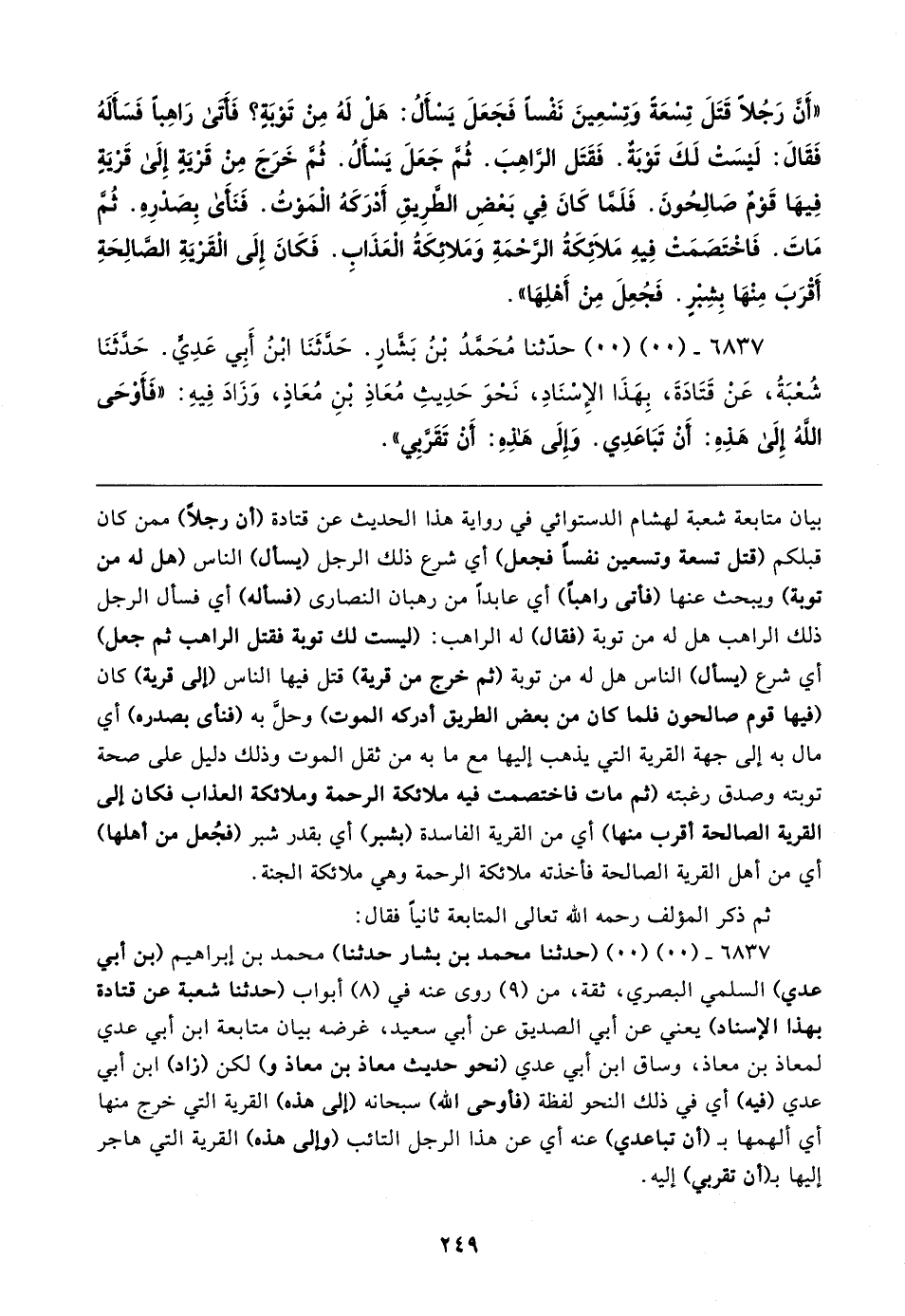 بيان متابعة شعبة لهشام الدستوائي في رواية هذا الحديث عن قتادة (أن رجلًا) ممن كان قبلكم (قتل تسعة وتسعين نفسًا فجعل) أي شرع ذلك الرَّجل (يسأل) النَّاس (هل له من توبة) ويبحث عنها (فأتى راهبًا) أي عابدًا من رهبان النصارى (فسأله) أي فسأل الرَّجل ذلك الراهب هل له من توبة (فقال) له الراهب: (ليست لك توبة فقتل الراهب ثم جعل) أي شرع (يسأل) النَّاس هل له من توبة (ثم خرج من قرية) قتل فيها النَّاس (إلى قرية) كان (فيها قوم صالحون فلما كان من بعض الطريق أدركه الموت) وحلَّ به (فنأى بصدره) أي مال به إلى جهة القرية التي يذهب إليها مع ما به من ثقل الموت وذلك دليل على صحة توبته وصدق رغبته (ثم مات فاختصمت فيه ملائكة الرحمة وملائكة العذاب فكان إلى القرية الصالحة أقرب منها) أي من القرية الفاسدة (بشبر) أي بقدر شبر (فجُعل من أهلها) أي من أهل القرية الصالحة فأخذته ملائكة الرحمة وهي ملائكة الجنة.