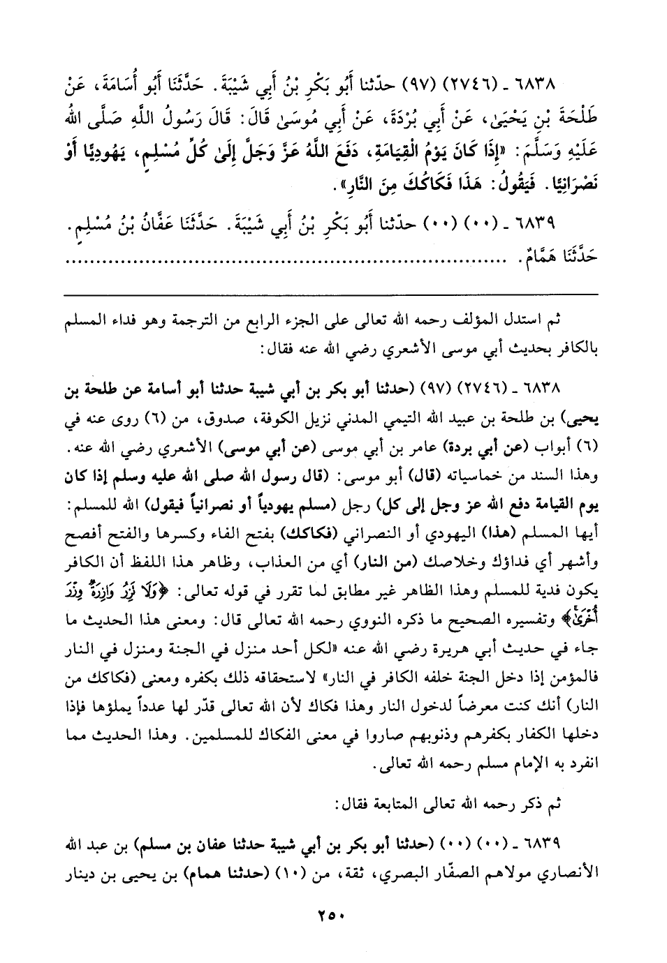 ٦٨٣٨ - (٢٧٤٦) (٩٧) (حَدَّثَنَا أبو بكر بن أبي شيبة حَدَّثَنَا أبو أسامة عن طلحة بن يحيى) بن طلحة بن عبيد الله التَّيْميّ المدنِيُّ نزيل الكوفة، صدوق، من (٦) روى عنه في (٦) أبواب (عن أبي بردة) عامر بن أبي موسى (عن أبي موسى) الأَشْعريّ رضي الله عنه. وهذا السند من خماسياته (قال) أبو موسى: (قال رسول الله صلى الله عليه وسلم إذا كان يوم القيامة دفع الله عَزَّ وَجَلَّ إلى كل) رجل (مسلم يهوديًا أو نصرانيًا فيقول) الله للمسلم: أيها المسلم (هذا) اليهودي أو النصراني (فكاكك) بفتح الفاء وكسرها والفتح أفصح وأشهر أي فداؤك وخلاصك (من النَّار) أي من العذاب، وظاهر هذا اللفظ أن الكافر يكون فدية للمسلم وهذا الظاهر غير مطابق لما تقرر في قوله تعالى: {وَلَا تَزِرُ وَازِرَةٌ وِزْرَ أُخْرَى} وتفسيره الصحيح ما ذكره النووي رحمه الله تعالى قال: ومعنى هذا الحديث ما جاء في حديث أبي هريرة رضي الله عنه "لكل أحد منزل في الجنة ومنزل في النَّار فالمؤمن إذا دخل الجنة خلفه الكافر في النَّار" لاستحقاقه ذلك بكفره ومعنى (فكاكك من النَّار) أنك كنت معرضًا لدخول النَّار وهذا فكاك لأن الله تعالى قدّر لها عددًا يملؤها فهذا دخلها الكفار بكفرهم وذنوبهم صاروا في معنى الفكاك للمسلمين. وهذا الحديث مما انفرد به الإِمام مسلم رحمه الله تعالى.