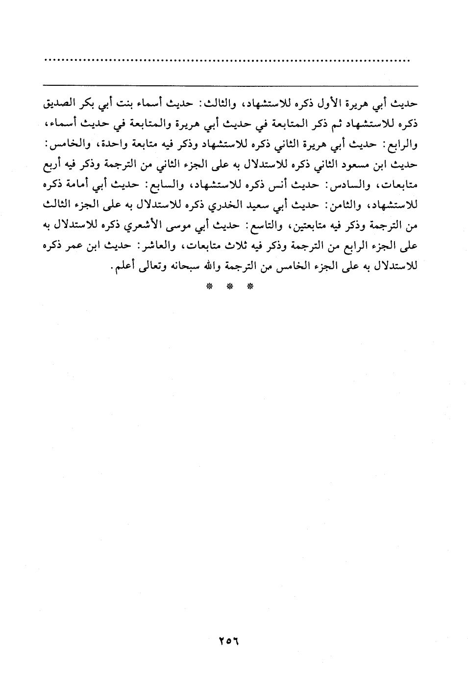 حديث أبي هريرة الأول ذكره للاستشهاد، والثالث: حديث أسماء بنت أبي بكر الصديق ذكره للاستشهاد ثم ذكر المتابعة في حديث أبي هريرة والمتابعة في حديث أسماء، والرابع: حديث أبي هريرة الثاني ذكره للاستشهاد وذكر فيه متابعة واحدة، والخامس: حديث ابن مسعود الثاني ذكره للاستدلال به على الجزء الثاني من الترجمة وذكر فيه أربع متابعات، والسادس: حديث أنس ذكره للاستشهاد، والسابع: حديث أبي أُمامة ذكره للاستشهاد، والثامن: حديث أبي سعيد الخُدرِيّ ذكره للاستدلال به على الجزء الثالث من الترجمة وذكر فيه متابعتين، والتاسع: حديث أبي موسى الأَشْعريّ ذكره للاستدلال به على الجزء الرابع من الترجمة وذكر فيه ثلاث متابعات، والعاشر: حديث ابن عمر ذكره للاستدلال به على الجزء الخامس عن الترجمة والله سبحانه وتعالى أعلم.