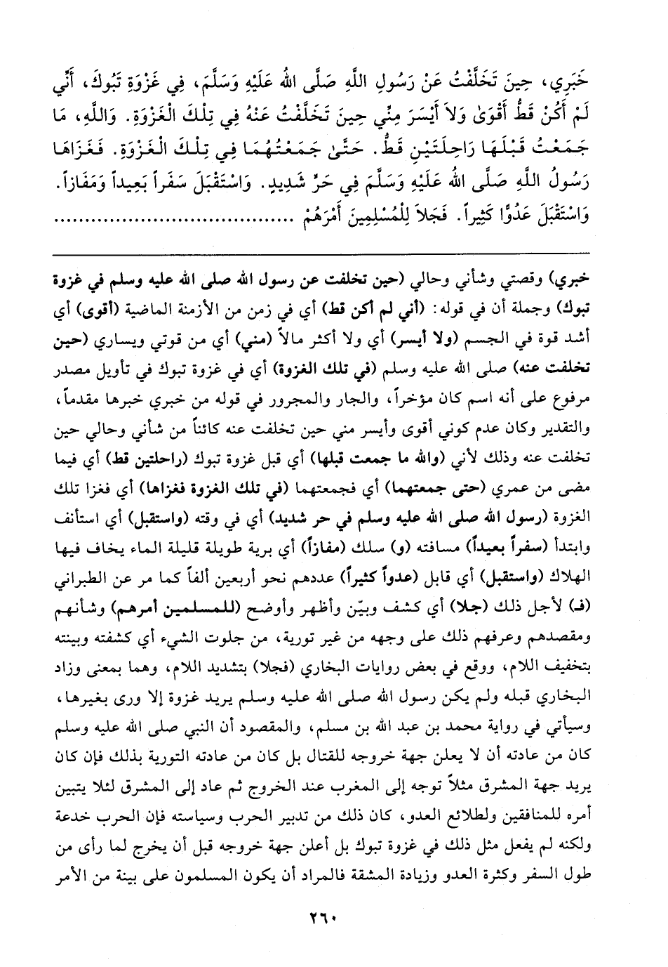 خَبَرِي، حِينَ تَخَلَّفْتُ عَنْ رَسُولِ اللهِ صَلَّى اللَّه عَلَيْهِ وَسَلَّمَ، فِي غَزْوَةِ تَبُوكَ، أَنِّي لَمْ أَكُنْ قَطُّ أَقْوَى وَلَا أَيْسَرَ مِنِّي حِينَ تَخَلَّفْتُ عَنْهُ فِي تِلْكَ الْغَزْوَةِ. وَاللهِ، مَا جَمَعْتُ قَبْلَهَا رَاحِلَتَيْنِ قَطُّ. حَتَّى جَمَعْتُهُمَا فِي تِلْكَ الْغَزْوَةِ. فَغَزَاهَا رَسُولُ اللهِ صَلَّى اللَّه عَلَيْهِ وَسَلَّمَ فِي حَرٍّ شَدِيدٍ. وَاسْتَقْبَلَ سَفَرًا بَعِيدًا وَمَفَازًا. وَاسْتَقْبَلَ عَدُوًّا كَثِيرًا. فَجَلَا لِلْمُسْلِمِينَ أَمْرَهُمْ