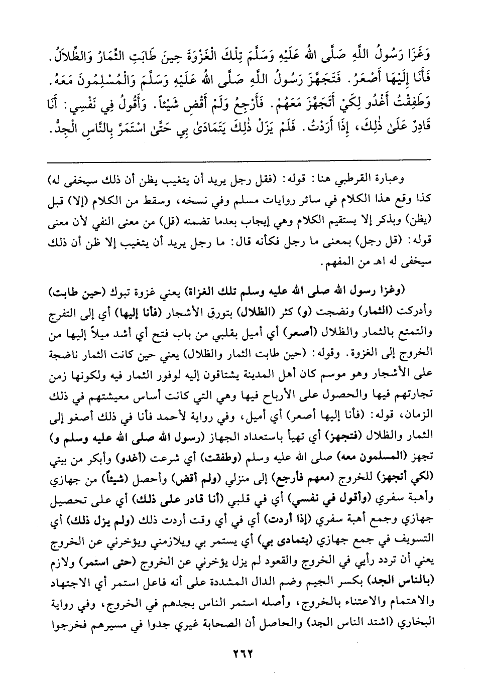 وَغَزَا رَسُولُ اللهِ صَلَّى اللَّه عَلَيْهِ وَسَلَّمَ تِلْكَ الْغَزْوَةَ حِينَ طَابَتِ الثِّمَارُ وَالظِّلَالُ. فَأَنَا إِلَيْهَا أَصْعَرُ. فَتَجَهَّزَ رَسُولُ اللهِ صَلَّى اللَّه عَلَيْهِ وَسَلَّمَ وَالْمُسْلِمُونَ مَعَهُ. وَطَفِقْتُ أَغْدُو لِكَيْ أَتَجَهَّزَ مَعَهُمْ. فَأَرْجِعُ وَلَمْ أَقْضِ شَيْئًا. وَأَقُولُ فِي نَفْسِي: أَنَا قَادِرٌ عَلَى ذلِكَ، إِذَا أَرَدْتُ. فَلَمْ يَزَلْ ذلِكَ يَتَمَادَى بِي حَتَّى اسْتَمَرَّ بِالنَّاسِ الْجِدُّ