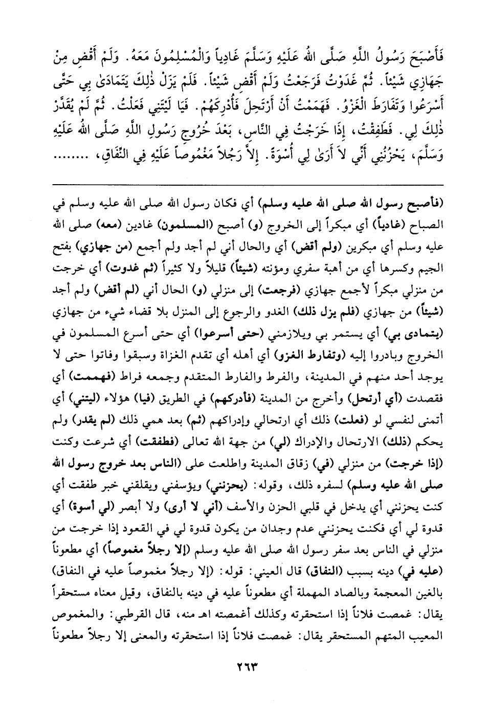 فَأَصْبَحَ رَسُولُ اللهِ صَلَّى اللَّه عَلَيْهِ وَسَلَّمَ غَادِيًا وَالْمُسْلِمُونَ مَعَهُ. وَلَمْ أَقْضِ مِنْ جَهَازِي شَيْئًا. ثُمَّ غَدَوْتُ فَرَجَعْتُ وَلَمْ أَقْضِ شَيْئًا. فَلَمْ يَزَلْ ذلِكَ يَتَمَادَى بِي حَتَّى أَسْرَعُوا وَتَفَارَطَ الْغَزْوُ. فَهَمَمْتُ أَنْ أَرْتَحِلَ فَأُدْرِكَهُمْ. فَيَا لَيْتَنِي فَعَلْتُ. ثُمَّ لَمْ يُقَدَّرْ ذلِكَ لِي. فَطَفِقْتُ، إِذَا خَرَجْتُ فِي النَّاسِ، بَعْدَ خُرُوجِ رَسُولِ اللهِ صَلَّى اللَّه عَلَيْهِ وَسَلَّمَ، يَحْزُنُنِي أَنِّي لَا أَرَى لِي أُسْوَةَ. إِلَاّ رَجُلًا مَغْمُوصًا عَلَيْهِ فِي النِّفَاقِ،