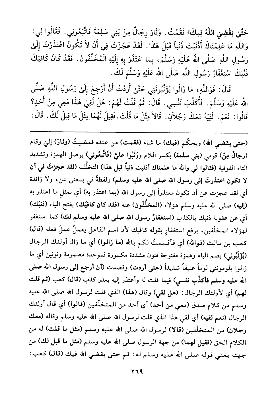 حَتَّى يَقْضِيَ اللهُ فِيكَ" فَقُمْتُ. وَثَارَ رِجَالٌ مِنْ بَنِي سَلِمَةَ فَاتَّبَعُونِي. فَقَالُوا لِي: وَاللهِ مَا عَلِمْنَاكَ أَذْنَبْتَ ذَنْبًا قَبْلَ هَذا. لَقَدْ عَجَزْتَ فِي أَنْ لَا تَكُونَ اعْتَذَرْتَ إِلَى رَسُولِ اللهِ صَلَّى اللَّه عَلَيْهِ وَسَلَّمَ، بِمَا اعْتَذَرَ بِهِ إِلَيْهِ الْمُخَلَّفُونَ. فَقَدْ كَانَ كَافِيَكَ ذَنْبَكَ اسْتِغْفَارُ رَسُولِ اللهِ صَلَّى اللَّه عَلَيهِ وَسَلَّمَ لَكَ.