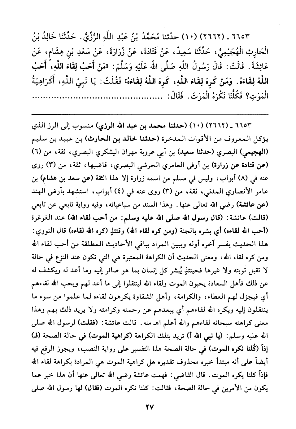 ٦٦٥٣ - (٢٦٦٢) (١٠) حدَّثنا مُحَمَّدُ بنُ عَبْدِ اللهِ الرُّزِّيُّ. حَدَّثَنَا خَالِدُ بْنُ الْحَارِثِ الْهُجَيمِيُّ، حَدَّثَنَا سَعِيدٌ، عَنْ قَتَادَةَ، عَنْ زُرَارَةَ، عَنْ سَعْدِ بْنِ هِشَامٍ، عَنْ عَائِشَةَ. قَالَت: قَالَ رَسُولُ اللهِ صَلَّى اللهُ عَلَيْهِ وَسَلَّمَ: "مَنْ أَحَبَّ لِقَاءَ اللهِ، أَحَبَّ اللهُ لِقَاءَهُ. وَمَق كَرِهَ لِقَاءَ اللهِ، كَرِهَ اللهُ لِقَاءَهُ! فَقُلْتُ: يَا نَبِيَّ اللهِ، أَكَرَاهِيَةُ الْمَوْتِ؛ فَكُلُّنَا نَكْرَهُ الْمَوْتِ. فَقَالَ: