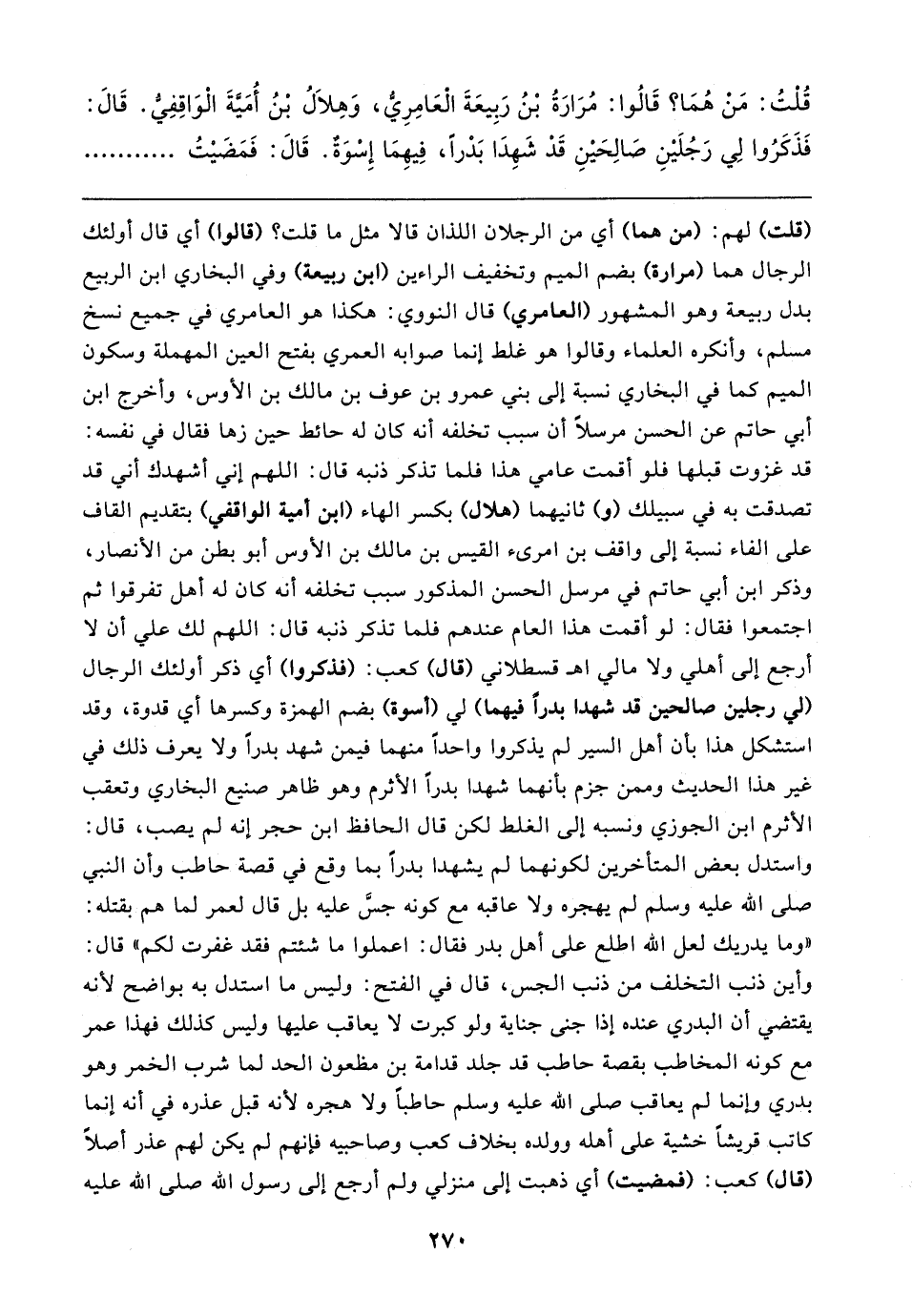 قُلْتُ: مَنْ هُمَا؟ قَالُوا: مُرَارَةُ بْنُ رَبِيعَةَ الْعَامِرِيُّ، وَهِلَالُ بْنُ أُمَيَّةَ الْوَاقِفِيُّ. قَالَ: فَذَكَرُوا لِي رَجُلَيْنِ صَالِحَيْنِ قَدْ شَهِدَا بَدْرًا، فِيهِمَا إِسْوَةٌ. قَالَ: فَمَضيْتُ