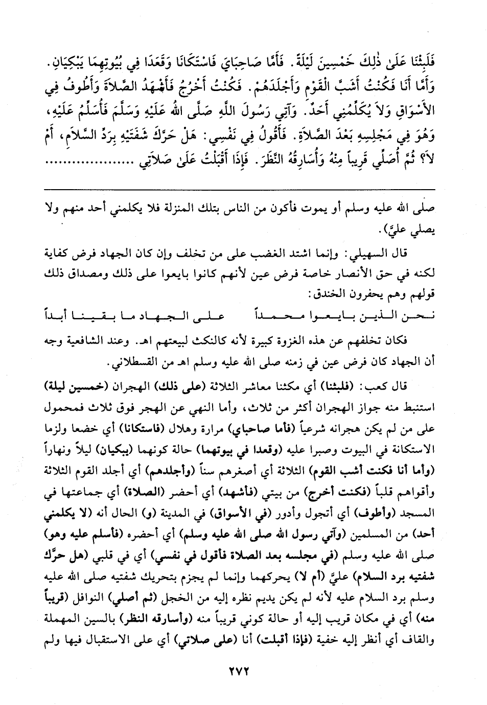 فَلَبِثنَا عَلَى ذلِكَ خَمْسِينَ لَيْلَةً. فَأَمَّا صَاحِبَايَ فَاسْتَكَانَا وَقَعَدَا فِي بُيُوتِهِمَا يَبْكِيَانِ. وَأَمَّا أَنَا فَكُنْتُ أَشَبَّ الْقَوْمِ وَأَجْلَدَهُمْ. فَكُنْتُ أَخْرُجُ فَأَشْهَدُ الصَّلَاةَ وَأَطُوفُ فِي الأَسْوَاقِ وَلَا يُكَلِّمُنِي أَحَدٌ. وَآتِي رَسُولَ اللهِ صَلَّى الله عَلَيهِ وَسَلَّمَ فَأُسَلِّمُ عَلَيْهِ، وَهُوَ فِي مَجْلِسِهِ بَعْدَ الصَّلَاةِ. فَأَقُولُ فِي نَفْسِي: هَل حَرَّكَ شَفَتَيهِ بِرَدِّ السَّلَامِ، أَمْ لَا؟ ثُمَّ أُصَلِّي قَرِيبًا مِنْهُ وَأُسَارِقُهُ النَّظَرَ. فَإِذَا أَقْبَلْتُ عَلَى صلَاتِي