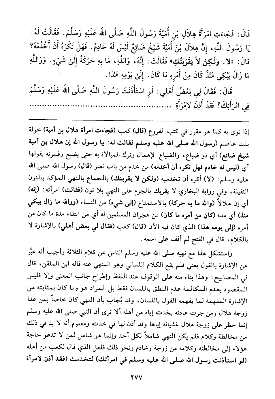 قَالَ: فَجَاءَتِ امْرَأَةُ هِلَالِ بْنِ أُمَيَّةَ رَسُولَ اللهِ صَلَّى اللَّه عَلَيْهِ وَسَلَّمَ. فَقَالَتْ لَهُ: يَا رَسُولَ اللهِ، إِنَّ هِلَالَ بْنَ أُمَيَّةَ شَيْخٌ ضَائِعٌ لَيْسَ لَهُ خَادِمٌ. فَهَلْ تَكْرَهُ أَنْ أَخْدُمَهُ؟ قَالَ: "لا. وَلكِنْ لَا يَقْرَبَنَّكِ" فَقَالَتْ: إِنَّهُ، وَاللهِ، مَا بِهِ حَرَكَةٌ إِلَى شَيْءٍ. وَوَاللهِ مَا زَالَ يَبْكِي مُنْذُ كَانَ مِنْ أَمْرِهِ مَا كَانَ. إِلَى يَوْمِهِ هَذَا.