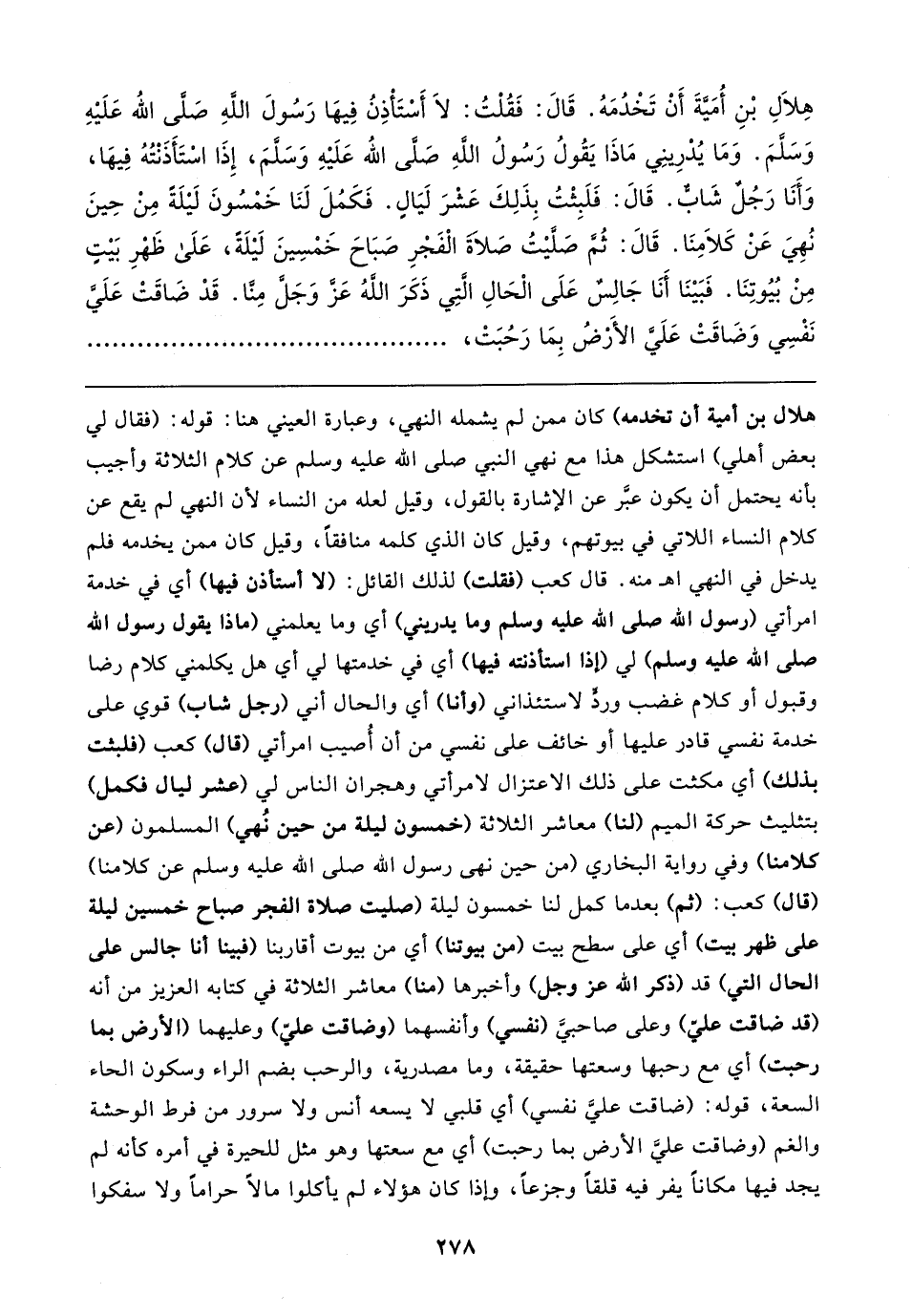 هِلَالِ بْنِ أُمَيَّةَ أَنْ تَخْدُمَهُ. قَالَ: فَقُلْتُ: لَا أَسْتَأْذِنُ فِيهَا رَسُولَ اللهِ صَلَّى اللَّه عَلَيْهِ وَسَلَّمَ. وَمَا يُدْرِينِي مَاذَا يَقُولُ رَسُولُ اللهِ صَلَّى اللَّه عَلَيْهِ وَسَلَّمَ، إِذَا اسْتَأَذَنْتُهُ فِيهَا، وَأَنَا رَجُلٌ شَابٌّ. قَالَ: فَلَبِثْتُ بِذَلِكَ عَشْرَ لَيَالٍ. فَكَمُلَ لَنَا خَمْسُونَ لَيْلَةً مِنْ حِينَ نُهِيَ عَنْ كَلَامِنَا. قَالَ: ثُمَّ صَلَّيْتُ صَلاةَ الْفَجْرِ صَبَاحَ خَمْسِينَ لَيْلَةً، عَلَى ظَهْرِ بَيْتٍ مِنْ بُيُوتِنَا. فَبَيْنَا أَنَا جَالِسٌ عَلَى الْحَالِ الَّ! تِي ذَكَرَ اللهُ عَزَّ وَجَلَّ مِنَّا. قَدْ ضَاقَتْ عَلَيَّ نَفْسِي وَضَاقَتْ عَلَيَّ الأَرْضُ بِمَا رَحُبَتْ،