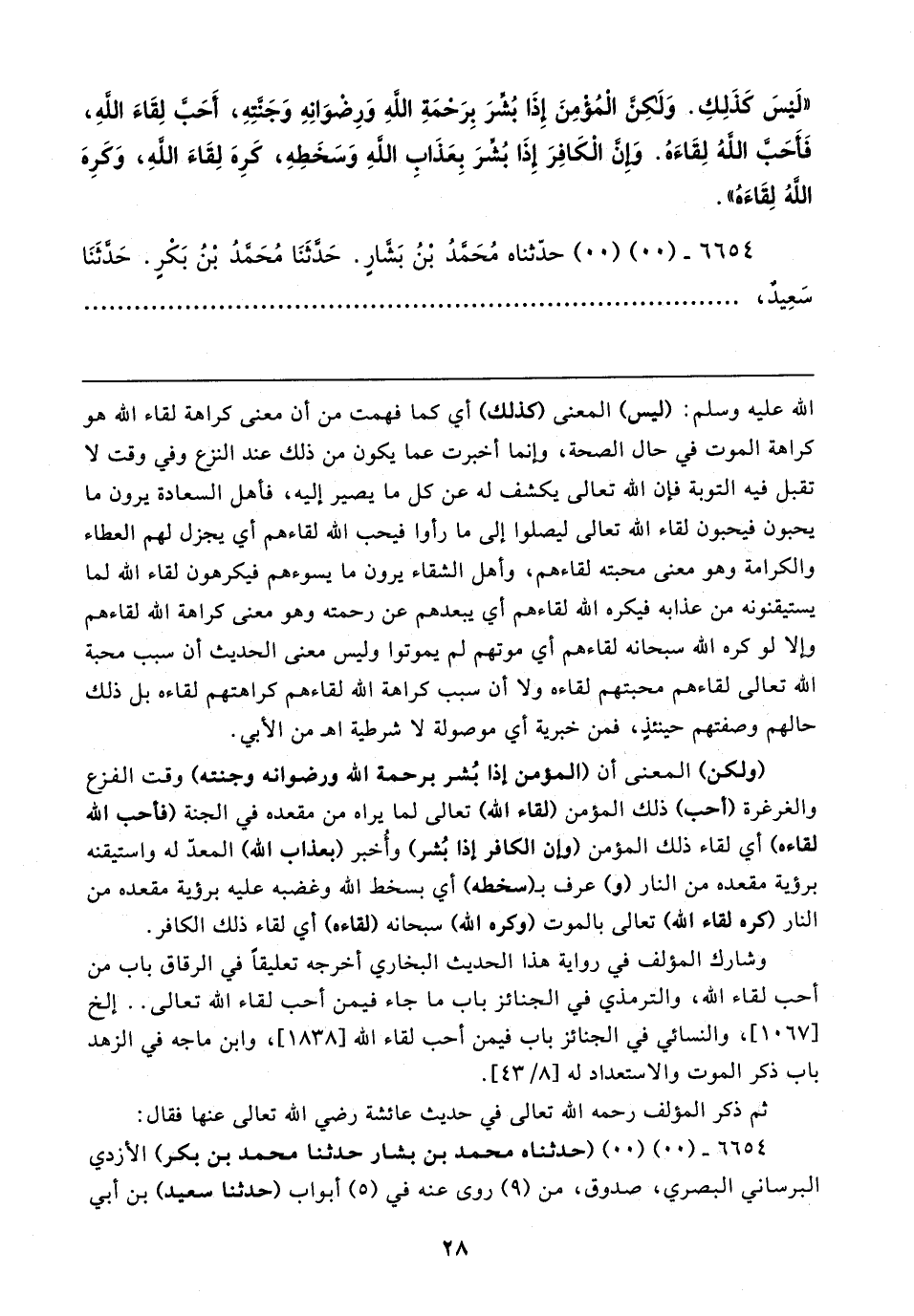 "لَيسَ كَذَلِكِ. وَلَكِن الْمُؤْمِنَ إِذَا بُشِّرَ بِرَحْمَةِ اللهِ وَرِضْوَانِهِ وَجَنَّتِهِ، أَحَبَّ لِقَاءَ اللهِ، فَأَحَبَّ اللَّهُ لِقَاءَهُ. وَإِنَّ الْكَافِرَ إِذَا بُشِّرَ بِعَذَاب اللهِ وَسَخَطِهِ، كَرِهَ لِقَاءَ اللَّهِ، وَكَرِهَ اللهُ لِقَاءَهُ".
