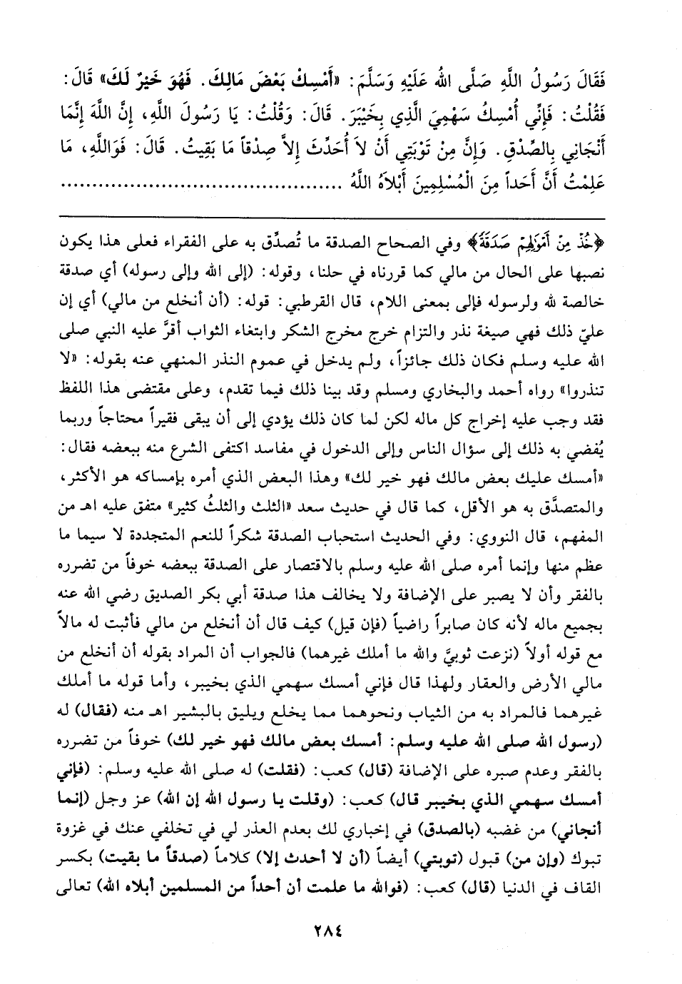 فَقَالَ رَسُولُ اللهِ صَلَّى اللَّه عَلَيْهِ وَسَلَّمَ: "أَمْسِكْ بَعْضَ مَالِكَ. فَهُوَ خَيْرٌ لَكَ" قَالَ: فَقُلْتُ: فَإِنِّي أُمْسِكُ سَهْمِيَ الَّذِي بِخَيْبَرَ. قَالَ: وَقُلْتُ: يَا رَسُولَ اللهِ، إِنَّ اللهَ إِنَّمَا أَنْجَانِي بِالصِّدْقِ. وَإِنَّ مِنْ تَوْبَتِي أَنْ لَا أُحَدِّثَ إِلَاّ صدْقًا مَا بَقِيتُ. قَالَ: فَوَاللَّهِ، مَا عَلِمْتُ أَنَّ أَحَدًا مِنَ الْمُسْلِمِينَ أَبْلَاهُ اللهُ