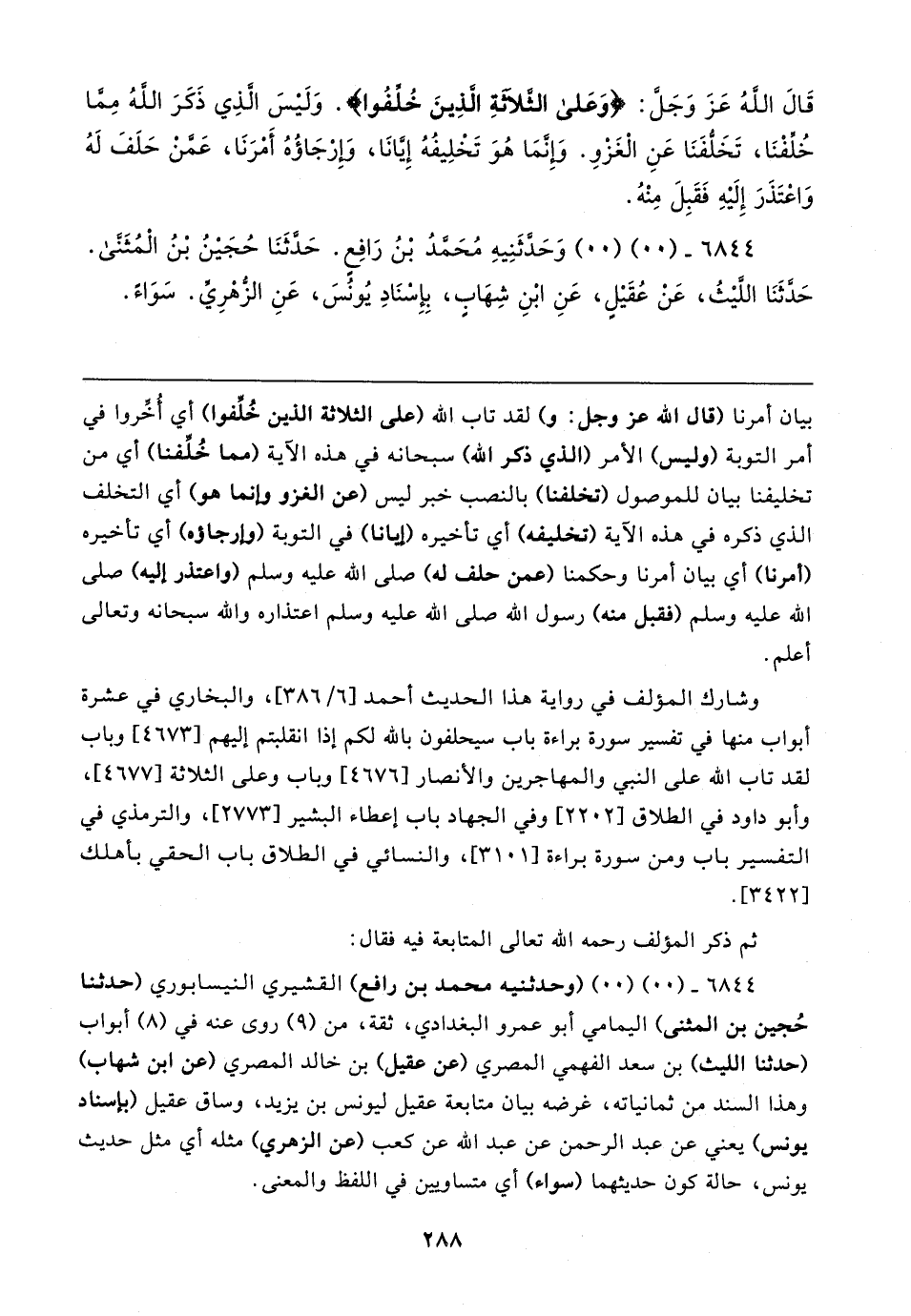 ٦٨٤٤ - (٠٠) (٠٠) (وحدثنيه محمد بن رافع) القشيري النيسابوري (حدثنا حُجين بن المثنى) اليمامي أبو عمرو البغدادي، ثقة، من (٩) روى عنه في (٨) أبواب (حدثنا الليث) بن سعد الفهمي المصري (عن عقيل) بن خالد المصري (عن ابن شهاب) وهذا السند من ثمانياته، غرضه بيان متابعة عقيل ليونس بن يزيد، وساق عقيل (بإسناد يونس) يعني عن عبد الرحمن عن عبد الله عن كعب (عن الزهري) مثله أي مثل حديث يونس، حالة كون حديثهما (سواء) أي متساويين في اللفظ والمعنى.