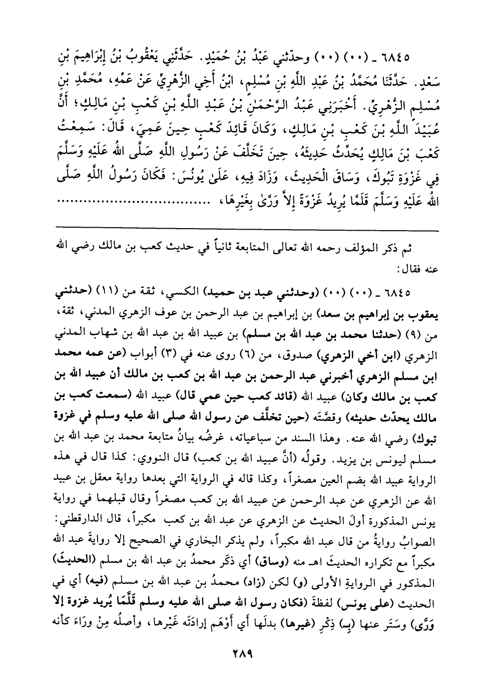 ٦٨٤٥ - (٠٠) (٠٠) (وحدثني عبد بن حميد) الكسي، ثقة من (١١) (حدثني يعقوب بن إبراهيم بن سعد) بن إبراهيم بن عبد الرحمن بن عوف الزهري المدني، ثقة، من (٩) (حدثنا محمد بن عبد الله بن مسلم) بن عبيد الله بن عبد الله بن شهاب المدني الزهري (ابن أخي الزهري) صدوق، من (٦) روى عنه في (٣) أبواب (عن عمه محمد ابن مسلم الزهري أخبرني عبد الرحمن بن عبد الله بن كعب بن مالك أن عبيد الله بن كعب بن مالك وكان) عبيد الله (قائد كعب حين عمي قال) عبيد الله (سمعت كعب بن مالك يحدّث حديثه) وقصَّتَه (حين تخلَّف عن رسول الله صلى الله عليه وسلم في غزوة تبوك) رضي الله عنه. وهذا السند من سباعياته، غرضُه بيانُ متابعة محمد بن عبد الله بن مسلم ليونس بن يزيد. وقولُه (أنَّ عبيد الله بن كعب) قال النووي: كذا قال في هذه الرواية عبيد الله بضم العين مصغرًا، وكذا قاله في الرواية التي بعدها رواية معقل بن عبيد الله عن الزهري عن عبد الرحمن عن عبيد الله بن كعب مصغرًا وقال قبلهما في رواية يونس المذكورة أولَ الحديث عن الزهري عن عبد الله بن كعب مكبرًا، قال الدارقطني: الصوابُ روايةُ من قال عبد الله مكبرًا، ولم يذكر البخاري في الصحيح إلَّا روايةَ عبد الله مكبرًا مع تكراره الحديثَ اه منه (وساق) أي ذكَر محمدُ بن عبد الله بن مسلم (الحديثَ) المذكور في الروايةِ الأولى (و) لكن (زاد) محمدُ بن عبد الله بن مسلم (فيه) أي في الحديث (على يونس) لفظةَ (فكان رسول الله صلى الله عليه وسلم قَلَّمَا يُريد غزوة إلَّا وَرَّى) وسَتَر عنها (بِـ) ذِكْرِ (غيرها) بدلَها أَي أَوْهَم إرادَتَه غَيْرها، وأصلُه مِنْ ورَاءَ كأنه