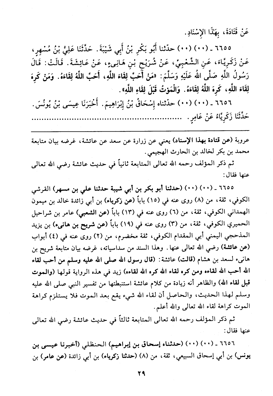٦٦٥٥ - (٠٠) (٠٠) (حَدَّثَنَا أبو بكر بن أبي شيبة حَدَّثَنَا علي بن مسهر) القرشي الكوفي، ثقة، من (٨) روى عنه في (١٥) بابًا (عن زكرياء) بن أبي زائدة خالد بن ميمون الهمداني الكوفي، ثقة، من (٦) روى عنه في (١٣) بابًا (عن الشعبي) عامر بن شراحيل الحميري الكوفي، ثقة، من (٣) روى عنه في (١٩) بابًا (عن شريح بن هانئ) بن يزيد المذحجي اليمني أبي المقدام الكوفي، ثقة مخضرم، من (٢) روى عنه في (٤) أبواب (عن عائشة) رضي الله تعالى عنها. وهذا السند من سداسياته، غرضه بيان متابعة شريح بن هانئ لسعد بن هشام (قالت) عائشة: (قال رسول الله صلى الله عليه وسلم من أحب لقاء الله أحب الله لقاءه ومن كره لقاء الله كره الله لقاءه) زيد في هذه الرواية قولها (والموت قبل لقاء الله) والظاهر أنَّه زيادة من كلام عائشة استنبطتها من تفسير النبي صلى الله عليه وسلم لهذا الحديث، والحاصل أن لقاء الله شيء يقع بعد الموت فلا يستلزم كراهة الموت كراهة لقاء الله تعالى والله أعلم.
