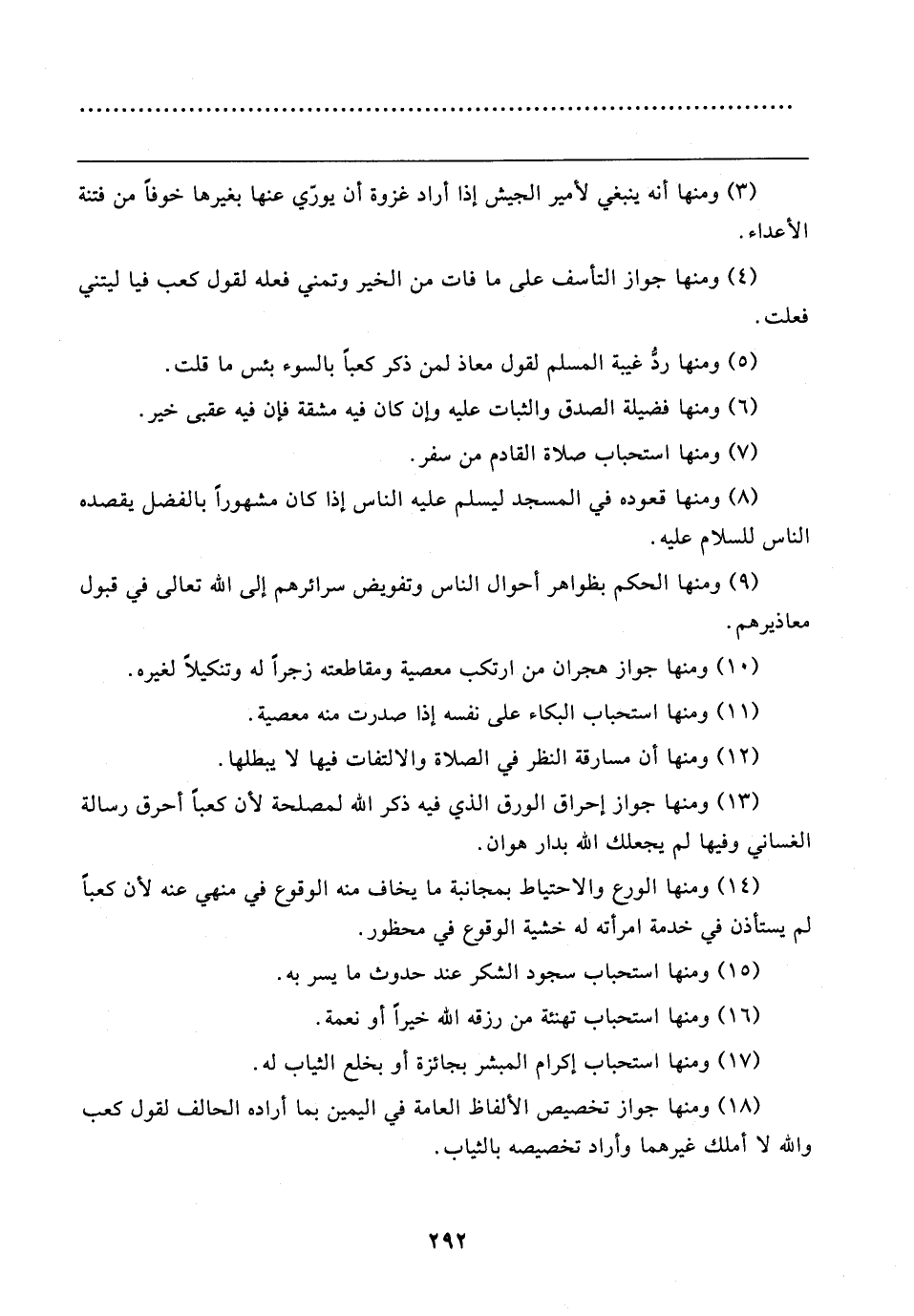 (١٨) ومنها جواز تخصيص الألفاظ العامة في اليمين بما أراده الحالف لقول كعب والله لا أملك غيرهما وأراد تخصيصه بالثياب.