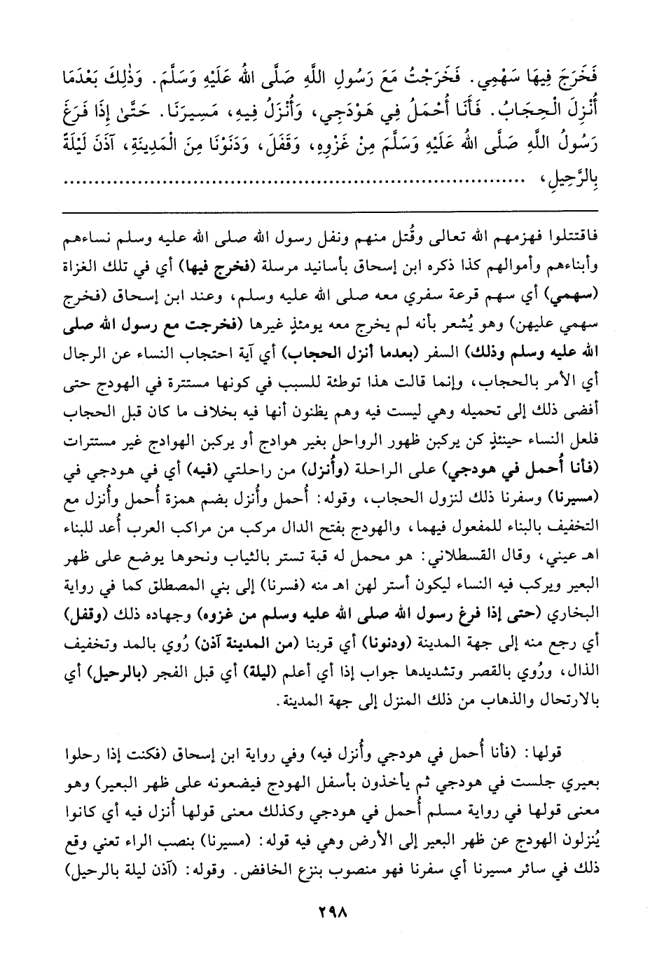 فاقتتلوا فهزمهم الله تعالى وقُتل منهم ونفل رسول الله صلى الله عليه وسلم نساءهم وأبناءهم وأموالهم كذا ذكره ابن إسحاق بأسانيد مرسلة (فخرج فيها) أي في تلك الغزاة (سهمي) أي سهم قرعة سفري معه صلى الله عليه وسلم، وعند ابن إسحاق (فخرج سهمي عليهن) وهو يُشعر بأنه لم يخرج معه يومئذٍ غيرها (فخرجت مع رسول الله صلى الله عليه وسلم وذلك) السفر (بعدما أنزل الحجاب) أي آية احتجاب النساء عن الرجال أي الأمر بالحجاب، وإنما قالت هذا توطئة للسبب في كونها مستترة في الهودج حتى أفضى ذلك إلى تحميله وهي ليست فيه وهم يظنون أنها فيه بخلاف ما كان قبل الحجاب فلعل النساء حينئذٍ كن يركبن ظهور الرواحل بغير هوادج أو يركبن الهوادج غير مستترات (فأنا أُحمل في هودجي) على الراحلة (وأُنزل) من راحلتي (فيه) أي في هودجي في (مسيرنا) وسفرنا ذلك لنزول الحجاب، وقوله: أُحمل وأُنزل بضم همزة أُحمل وأُنزل مع التخفيف بالبناء للمفعول فيهما، والهودج بفتح الدال مركب من مراكب العرب أُعد للبناء اه عيني، وقال القسطلاني: هو محمل له قبة تستر بالثياب ونحوها يوضع على ظهر البعير ويركب فيه النساء ليكون أستر لهن اه منه (فسرنا) إلى بني المصطلق كما في رواية البخاري (حتى إذا فرغ رسول الله صلى الله عليه وسلم من غزوه) وجهاده ذلك (وقفل) أي رجع منه إلى جهة المدينة (ودنونا) أي قربنا (من المدينة آذن) رُوي بالمد وتخفيف الذال، ورُوي بالقصر وتشديدها جواب إذا أي أعلم (ليلة) أي قبل الفجر (بالرحيل) أي بالارتحال والذهاب من ذلك المنزل إلى جهة المدينة.