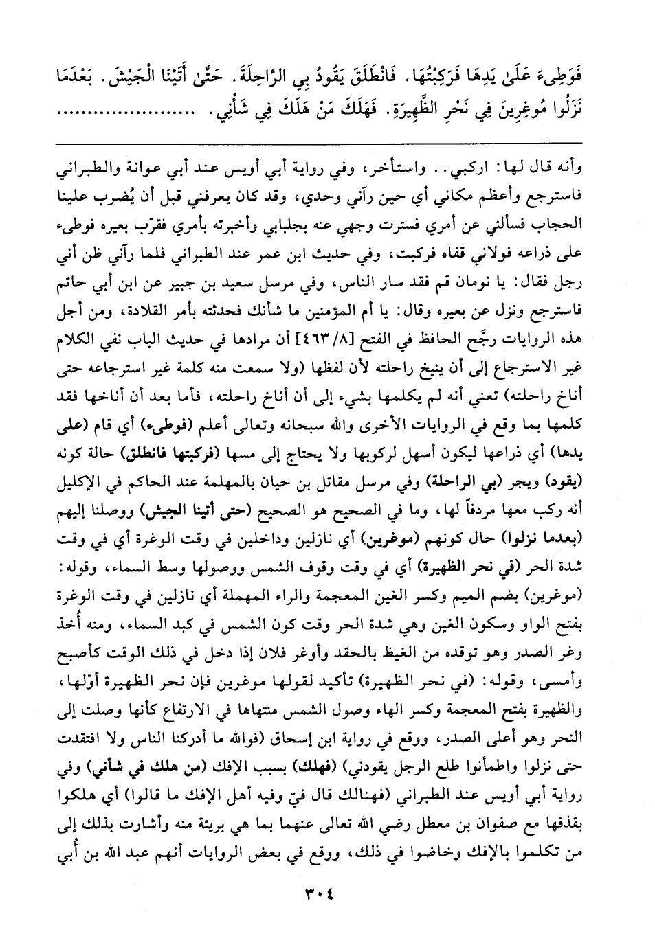 فَوَطِئَ عَلَى يَدِهَا فَرَكِبْتُهَا. فَانْطَلَقَ يَقُودُ بِي الرَّاحِلَةَ. حَتَّى أَتَينَا الْجَيْشَ. بَعْدَمَا نَزَلُوا مُوغِرِينَ فِي نَحْرِ الظَّهِيرَةِ. فَهَلَكَ مَنْ هَلَكَ فِي شَأْنِي