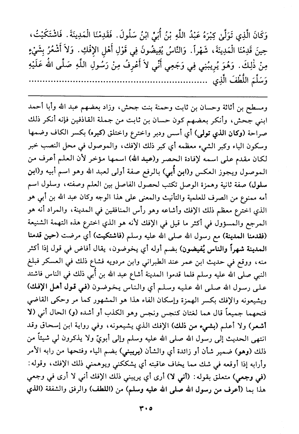 وَكَانَ الَّذِي تَوَلَّى كِبْرَهُ عَبْدُ اللهِ بْنُ أُبَيِّ ابْنُ سَلُولَ. فَقَدِمْنَا الْمَدِينَةَ. فَاشْتَكَيْتُ، حِينَ قَدِمْنَا الْمَدِينَةَ، شَهْرًا. وَالنَّاسُ يُفِيضُونَ فِي قَوْلِ أَهْلِ الإِفْكِ. وَلَا أَشعُرُ بِشَيْءِ مِنْ ذلِكَ. وَهُوَ يُرِيبُنِي فِي وَجَعِي أَنِّي لَا أَعْرِفُ مِنْ رَسُولِ اللهِ صَلَّى اللهُ عَلَيْهِ وَسَلَّمَ اللُّطْفَ الَّذِي