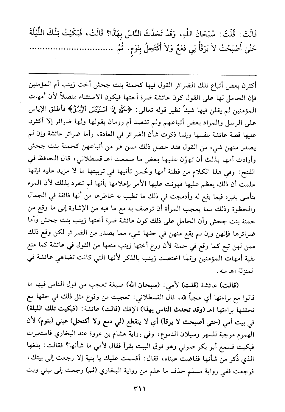قَالَتْ: قُلْتُ: سُبْحَانَ اللهِ، وَقَدْ تَحَدَّثَ النَّاسُ بِهَذَا؟ قَالَتْ، فَبَكَيْتُ تِلْكَ اللَّيْلَةَ حَتَّى أَصْبَحْتُ لَا يَرْقَأُ لِي دَمْعٌ وَلَا أَكْتَحِلُ بِنَوْمٍ. ثُمَّ