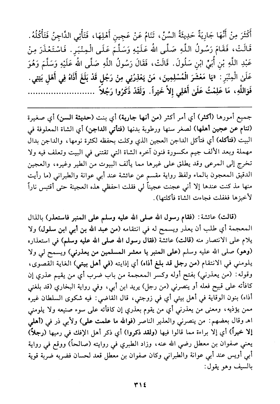 أَكْثَرَ مِنْ أَنَّهَا جَارِيَةٌ حَدِيثَةُ السِّنِّ، تَنَامُ عَنْ عَجِينِ أَهْلِهَا، فَتَأْتِي الدَّاجِنُ فَتَأْكُلُهُ. قَالَتْ، فَقَامَ رَسُولُ اللهِ صَلَّى اللَّه عَلَيْهِ وَسَلَّمَ عَلَى الْمِنْبَرِ. فَاسْتَعْذَرَ مِنْ عَبْدِ اللهِ بْنِ أُبَيِّ ابْنِ سَلُولَ. قَالَتْ، فَقَالَ رَسُولُ اللهِ صَلَّى اللَّه عَلَيْهِ وَسَلَّمَ وَهُوَ عَلَى الْمِنْبَرِ: "يَا مَعْشَرَ الْمُسْلِمِينَ، مَنْ يَعْذِرُنِي مِنْ رَجُلٍ قَدْ بَلَغَ أَذَاهُ فِي أَهْلِ بَيتِي. فَوَاللهِ، مَا عَلِمْتُ عَلَى أَهْلِي إِلَاّ خَيْرًا. وَلَقَدْ ذَكَرُوا رَجُلًا