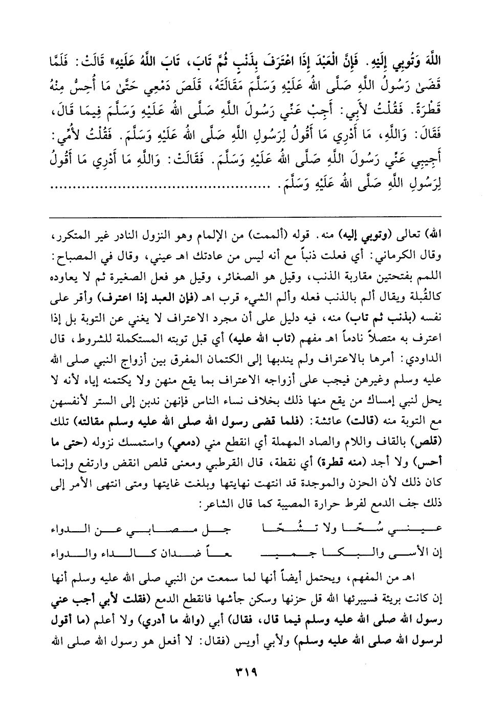 اللَّهَ وَتُوبِي إِلَيْهِ. فَإِنَّ الْعَبْدَ إِذَا اعْتَرَفَ بذَنْبٍ ثُمَّ تَابَ، تَابَ اللهُ عَلَيهِ" قَالَتْ: فَلَمَّا قَضَى رَسُولُ اللهِ صَلَّى الله عَلَيْهِ وَسَلًّمَ مَقَالَتَهُ، قَلَصَ دَمْعِي حَتَّى مَا أُحِسُّ مِنْهُ قَطْرَةً. فَقُلْتُ لأَبِي: أَجِبْ عَنِّي رَسُولَ اللهِ صَلَّى اللَّه عَلَيْهِ وَسَلَّمَ فِيمَا قَالَ، فَقَالَ: وَاللَّهِ، مَا أَدْرِي مَا أَقُولُ لِرَسُولِ اللهِ صَلَى اللَّه عَلَيْهِ وَسَلَّمَ. فَقُلْتُ لأُمِّي: أَجِيبِي عَنِّي رَسُولَ اللهِ صَلَّى اللَّه عَلَيْهِ وَسَلَّمَ. فَقَالَتْ: وَاللهِ مَا أَدْرِي مَا أَقُولُ لِرَسُولِ اللهِ صَلَّى اللَّه عَلَيْهِ وَسَلَّمَ