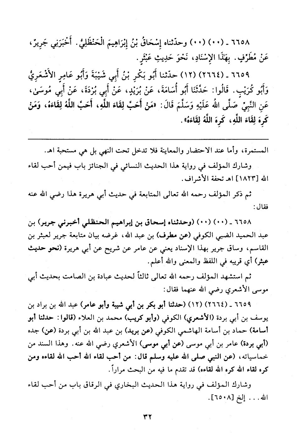 ٦٦٥٩ - (٢٦٦٤) (١٢) (حَدَّثَنَا أبو بكر بن أبي شيبة وأبو عامر) عبد الله بن براد بن يوسف بن أبي بردة (الأشعري) الكوفي (وأبو غريب) محمد بن العلاء (قالوا: حَدَّثَنَا أبو أسامة) حماد بن أسامة الهاشمي الكوفي (عن بريد) بن عبد الله بن أبي بردة (عن) جده (أبي بردة) عامر بن أبي موسى (عن أبي موسى) الأشعري رضي الله عنه. وهذا السند من خماسياته، (عن النبي صلى الله عليه وسلم قال: من أحب لقاء الله أحب الله لقاءه ومن كره لقاء الله كره الله لقاءه) قد تقدم ما فيه من البحث مرارًا.