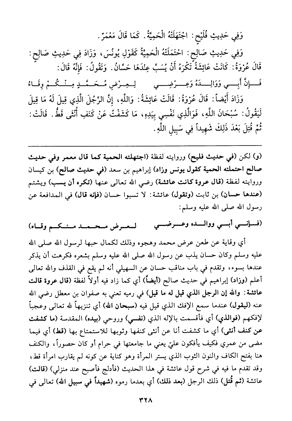 وَفِي حَدِيثِ صَالِحٍ: احْتَمَلَتْهُ الْحَمِيَّةُ كَقَوْلِ يُونُسَ، وَزَادَ فِي حَدِيثِ صَالِحٍ: قَالَ عُرْوَةُ: كَانَتْ عَائِشَةُ تَكْرَهُ أَنْ يُسَبَّ عِنْدَهَا حَسَّانُ. وَتَقُولُ: فَإِنَّهُ قَالَ: