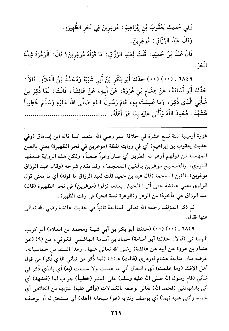غزوة أرمينية سنة تسع عشرة في خلافة عمر رضي الله عنهما كما قاله ابن إسحاق (وفي حديث يعقوب بن إبراهيم) أي في روايته لفظة (موعرين في نحر الظهيرة) يعني بالعين المهملة من قولهم أوعر به الطريق أي صار وعرًا صعبًا، ولكن هذه الرواية ضعفها النووي، والصحيح موغرين بالغين المعجمة، وقد تقدم شرحه (وقال عبد الرزاق موغرين) بالغين المعجمة (قال عبد بن حميد قلت لعبد الرزاق ما قوله) أي ما معنى قول الراوي يعني عائشة حتى أتينا الجيش بعدما نزلوا (موغرين) في نحر الظهيرة (قال) عبد الرزاق هي مأخوذة من الوغر و (الوغرة شدة الحر) في وقت الظهيرة.