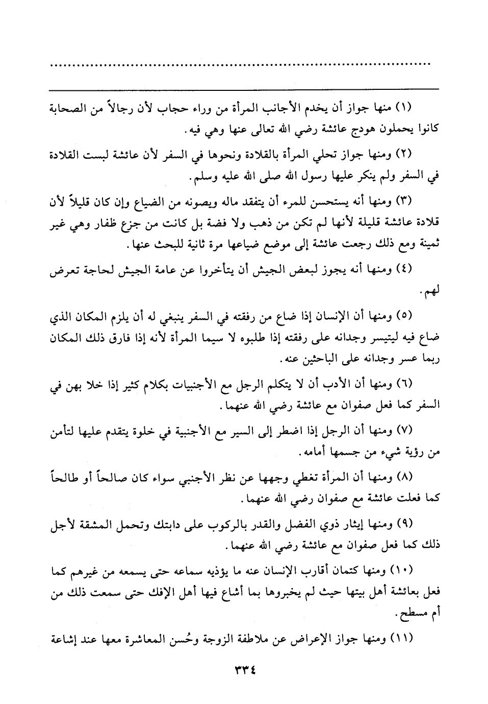 (٦) ومنها أن الأدب أن لا يتكلم الرجل مع الأجنبيات بكلام كثير إذا خلا بهن في السفر كما فعل صفوان مع عائشة رضي الله عنهما.