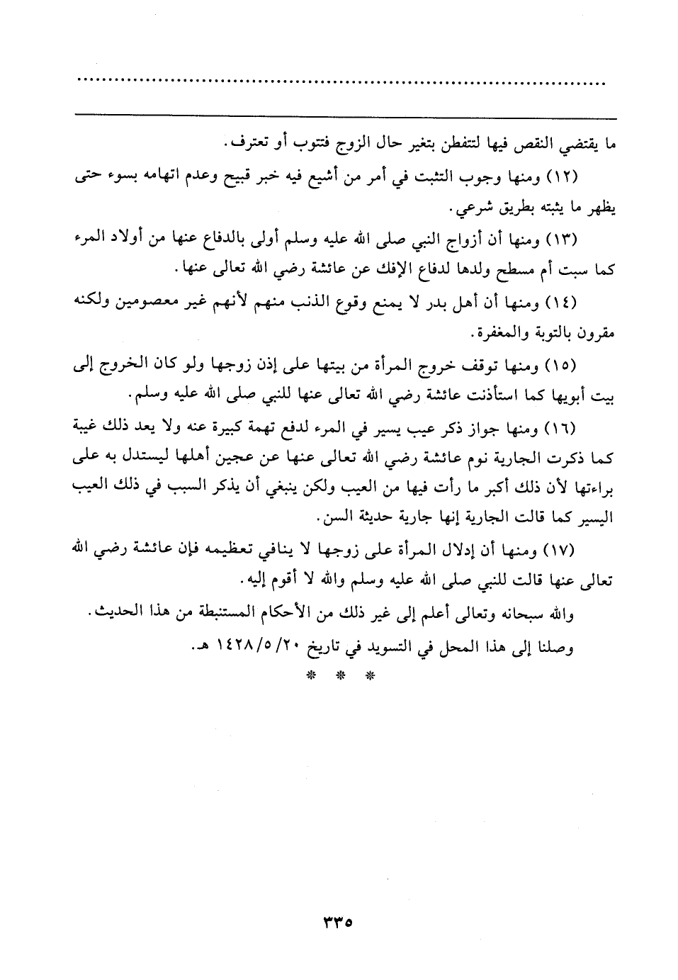 (١٣) ومنها أن أزواج النبي صلى الله عليه وسلم أولى بالدفاع عنها من أولاد المرء كما سبت أم مسطح ولدها لدفاع الإفك عن عائشة رضي الله تعالى عنها.