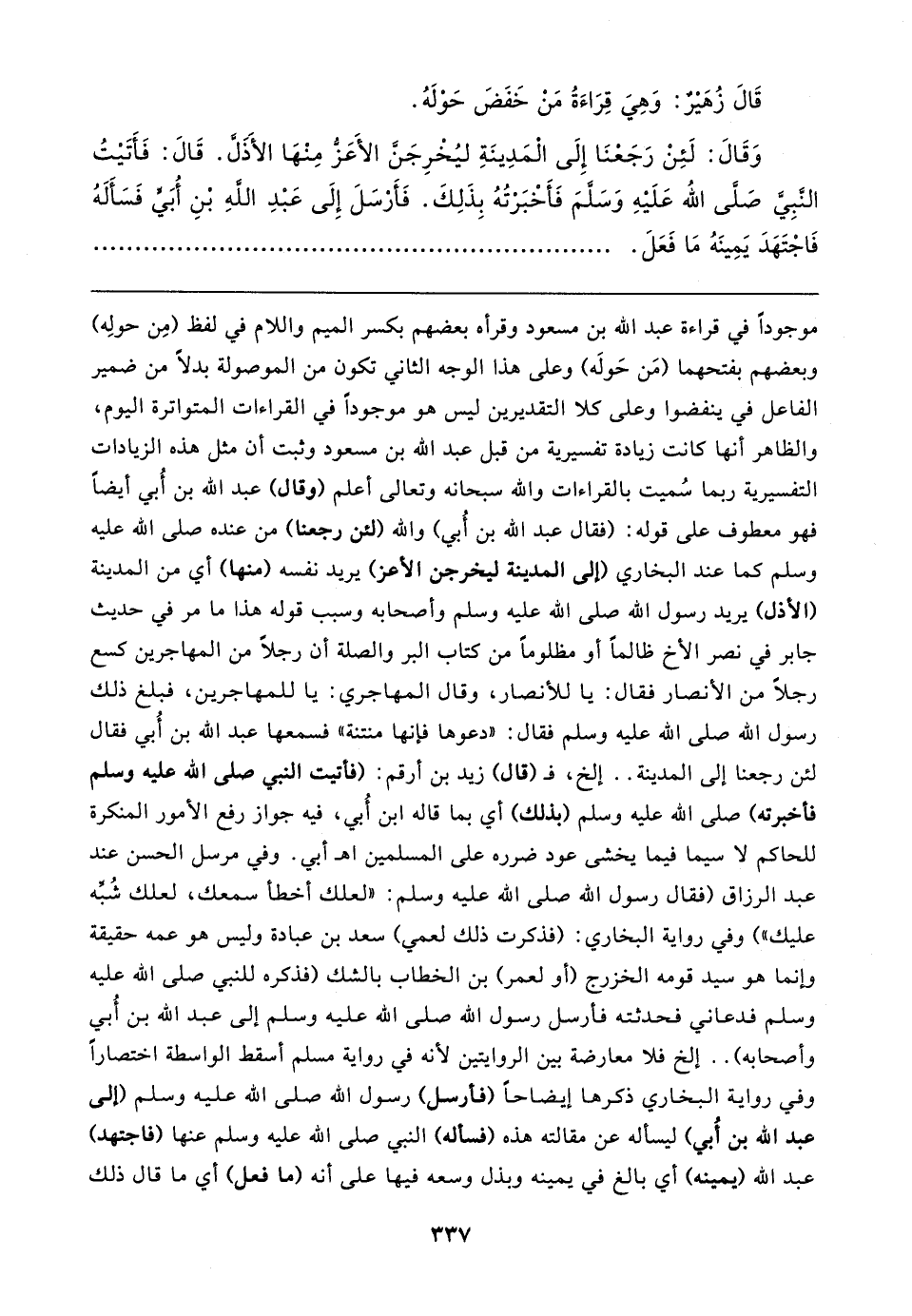 موجودًا في قراءة عبد الله بن مسعود وقرأه بعضهم بكسر الميم واللام في لفظ (مِن حولِه) وبعضهم بفتحهما (مَن حَولَه) وعلى هذا الوجه الثاني تكون من الموصولة بدلًا من ضمير الفاعل في ينفضوا وعلى كلا التقديرين ليس هو موجودًا في القراءات المتواترة اليوم، والظاهر أنها كانت زيادة تفسيرية من قبل عبد الله بن مسعود وثبت أن مثل هذه الزيادات التفسيرية ربما سُميت بالقراءات والله سبحانه وتعالى أعلم (وقال) عبد الله بن أُبي أيضًا فهو معطوف على قوله: (فقال عبد الله بن أُبي) والله (لئن رجعنا) من عنده صلى الله عليه وسلم كما عند البخاري (إلى المدينة ليخرجن الأعز) يريد نفسه (منها) أي من المدينة (الأذل) يريد رسول الله صلى الله عليه وسلم وأصحابه وسبب قوله هذا ما مر في حديث جابر في نصر الأخ ظالمًا أو مظلومًا من كتاب البر والصلة أن رجلًا من المهاجرين كسع رجلًا من الأنصار فقال: يا للأنصار، وقال المهاجري: يا للمهاجرين، فبلغ ذلك رسول الله صلى الله عليه وسلم فقال: "دعوها فإنها منتنة" فسمعها عبد الله بن أُبي فقال لئن رجعنا إلى المدينة .. إلخ، فـ (قال) زيد بن أرقم: (فأتيت النبي صلى الله عليه وسلم فأخبرته) صلى الله عليه وسلم (بذلك) أي بما قاله ابن أُبي، فيه جواز رفع الأمور المنكرة للحاكم لا سيما فيما يخشى عود ضرره على المسلمين اه أبي. وفي مرسل الحسن عند عبد الرزاق (فقال رسول الله صلى الله عليه وسلم: "لعلك أخطأ سمعك، لعلك شُبِّه عليك") وفي رواية البخاري: (فذكرت ذلك لعمي) سعد بن عبادة وليس هو عمه حقيقة وإنما هو سيد قومه الخزرج (أو لعمر) بن الخطاب بالشك (فذكره للنبي صلى الله عليه وسلم فدعاني فحدثته فأرسل رسول الله صلى الله عليه وسلم إلى عبد الله بن أُبي وأصحابه) .. إلخ فلا معارضة بين الروايتين لأنه في رواية مسلم أسقط الواسطة اختصارًا وفي رواية البخاري ذكرها إيضاحًا (فأرسل) رسول الله صلى الله عليه وسلم (إلى عبد الله بن أُبي) ليسأله عن مقالته هذه (فسأله) النبي صلى الله عليه وسلم عنها (فاجتهد) عبد الله (يمينه) أي بالغ في يمينه وبذل وسعه فيها على أنه (ما فعل) أي ما قال ذلك