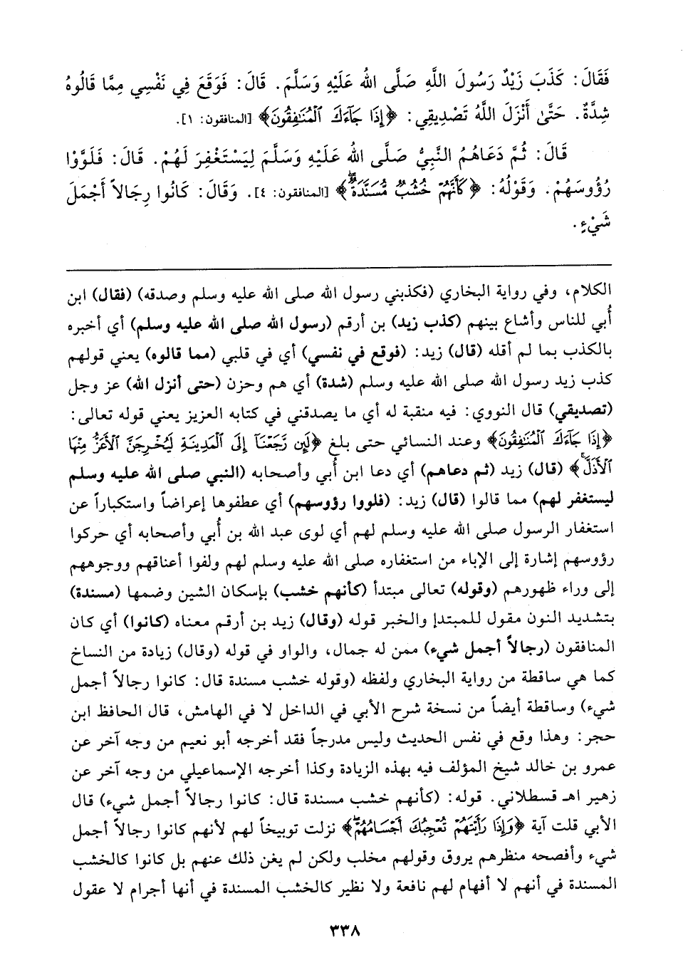 فَقَالَ: كَذَبَ زَيْدٌ رَسُولَ اللهِ صَلَّى اللَّه عَلَيْهِ وَسَلَّمَ. قَالَ: فَوَقَعَ فِي نَفْسِي مِمَّا قَالُوهُ شِدَّةٌ. حَتَّى أَنْزَلَ اللهُ تَصْدِيقِي: {إِذَا جَاءَكَ الْمُنَافِقُونَ} [المنافقون: ١].