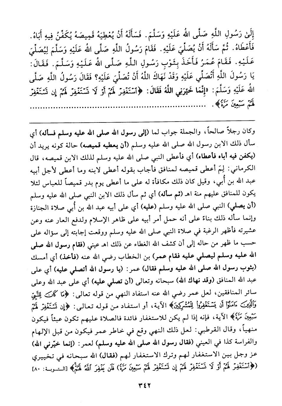 إِلَى رَسُولِ اللهِ صَلَّى اللهُ عَلَيْهِ وَسَلَّمَ. فَسَأَلَهُ أَنْ يُعْطِيَهُ قَمِيصَهُ يُكَفِّنُ فِيهِ أَبَاهُ. فَأَعْطَاهُ. ثُمَّ سَأَلَهُ أَنْ يُصَلِّيَ عَلَيْهِ. فَقَامَ رَسُولُ اللهِ صَلَّى اللَّه عَلَيْهِ وَسَلَّمَ لِيُصَلِّيَ عَلَيْهِ. فَقَامَ عُمَرُ فَأَخَذَ بِثَوْبِ رَسُولِ اللهِ صَلَّى اللَّه عَلَيْهِ وَسَلَّمَ. فَقَالَ: يَا رَسُولَ اللهِ أَتُصَلِّي عَلَيْهِ وَقَدْ نَهَاكَ اللهُ أَنْ تُصَلِّيَ عَلَيْهِ؟ فَقَالَ رَسُولُ اللهِ صَلَّى اللَّه عَلَيْهِ وَسَلَّمَ: "إِنَّمَا خَيرَنِي اللهُ فَقَالَ: {اسْتَغْفِرْ لَهُمْ أَوْ لَا تَسْتَغْفِرْ لَهُمْ إِنْ تَسْتَغْفِرْ لَهُمْ سَبْعِينَ مَرَّةً}