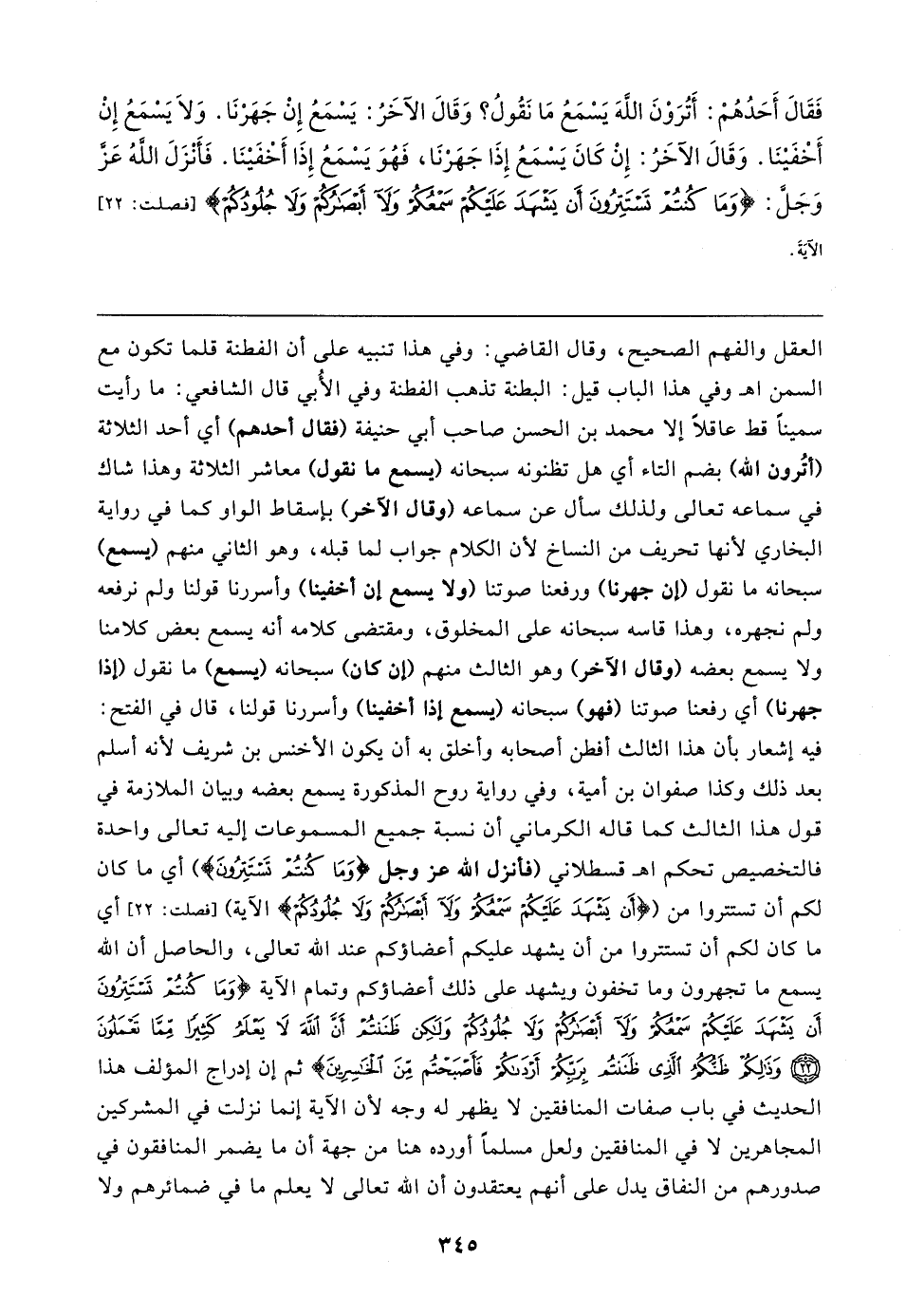 فَقَالَ أَحَدُهُمْ: أَتُرَوْنَ اللهَ يَسْمَعُ مَا نَقُولُ؟ وَقَالَ الآخَرُ: يَسْمَعُ إِنْ جَهَرْنَا. وَلَا يَسْمَعُ إِنْ أَخْفَيْنَا. وَقَالَ الآخَرُ: إِنْ كَانَ يَسْمَعُ إذَا جَهَرْنَا، فَهُوَ يَسْمَعُ إِذَا أَخْفَيْنَا. فَأَنْزَلَ اللهُ عَزَّ وَجَلَّ: {وَمَا كُنْتُمْ تَسْتَتِرُونَ أَنْ يَشْهَدَ عَلَيْكُمْ سَمْعُكُمْ وَلَا أَبْصَارُكُمْ وَلَا جُلُودُكُمْ} [فصلت: ٢٢] الآيَةَ