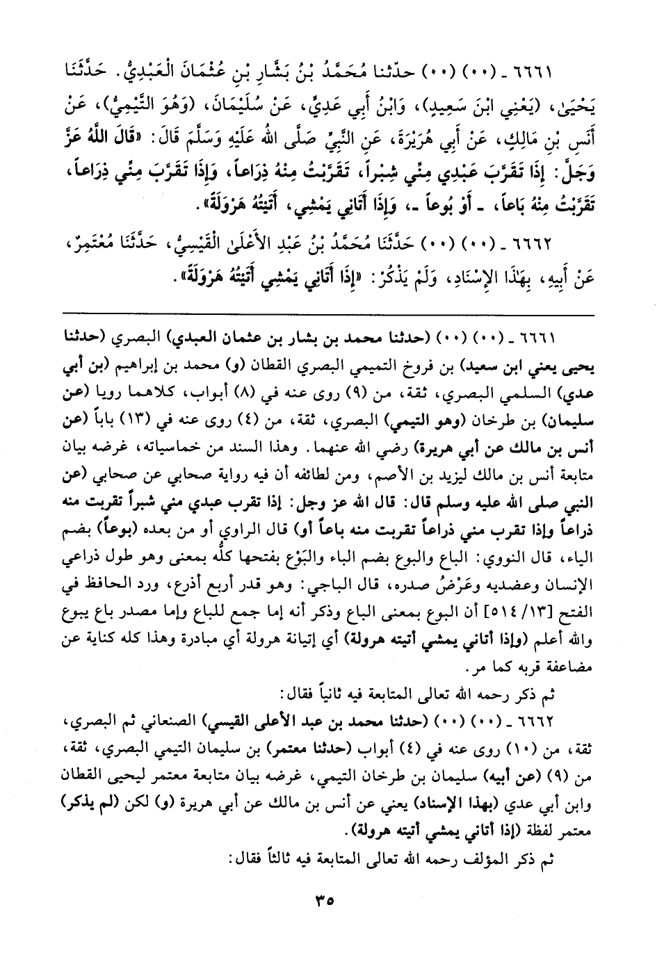 ٦٦٦١ - (٠٠) (٠٠) (حدّثنا مُحَمَّدُ بْنُ بَشَّارِ بنِ عُثمَانَ الْعَبْدِيُّ. حَدَّثَنَا يَحْيَى، (يَعْنِي ابْنَ سَعِيدٍ)، وَابْنُ أَبِي عَدِيٍّ، عَنْ سُلَيْمَانَ، (وَهُوَ التَّيْمِيُّ)، عَنْ أَنَسِ بْنِ مَالِكٍ، عَنْ أَبِي هُرَيْرَةَ، عَنِ النَّبِيِّ صَلَّى اللَّه عَلَيْهِ وَسَلَّمَ قَالَ: "قَالَ اللهُ عَزَّ وَجَلَّ: إِذَا تَقَرَّبَ عَبْدِي مِنِّي شِبرًا، تَقَرَّبْتُ مِنْهُ ذِرَاعًا، وَإِذَا تَقَرَّبَ مِنِّي ذِرَاعًا، تَقَرَّبْتُ مِنْهُ بَاعًا، - أَوْ بُوعًا -، وَإِذَا أَتَانِي يَمْشِي، أَتَيْتُهُ هَرْوَلَةً".