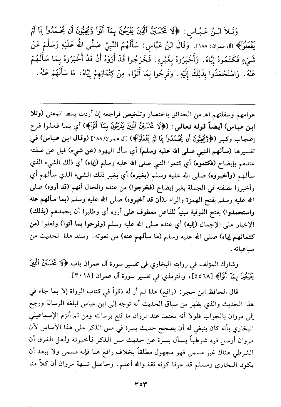 وَتَلَا ابْنُ عَبَّاسٍ: {لَا تَحْسَبَنَّ الَّذِينَ يَفْرَحُونَ بِمَا أَتَوْا وَيُحِبُّونَ أَنْ يُحْمَدُوا بِمَا لَمْ يَفْعَلُوا} [آل عمران: ١٨٨]. وَقَالَ ابْنُ عَبَّاسٍ: سَأَلَهُمُ النَّبِيُّ صَلَّى اللَّه عَلَيْهِ وَسَلَّمَ عَنْ شَيْءٍ فَكَتَمُوهُ إِيَّاهُ. وَأَخْبَرُوهُ بِغَيْرِهِ. فَخَرَجُوا قَدْ أَرَوْهُ أَنْ قَدْ أَخْبَرُوهُ بِمَا سَأَلَهُمْ عَنْهُ. وَاسْتَحْمَدُوا بِذَلِكَ إِلَيْهِ. وَفَرِحُوا بِمَا أَتَوْا، مِنْ كِتْمَانِهِمْ إِيَّاهُ، مَا سَأَلَهُمْ عَنْهُ