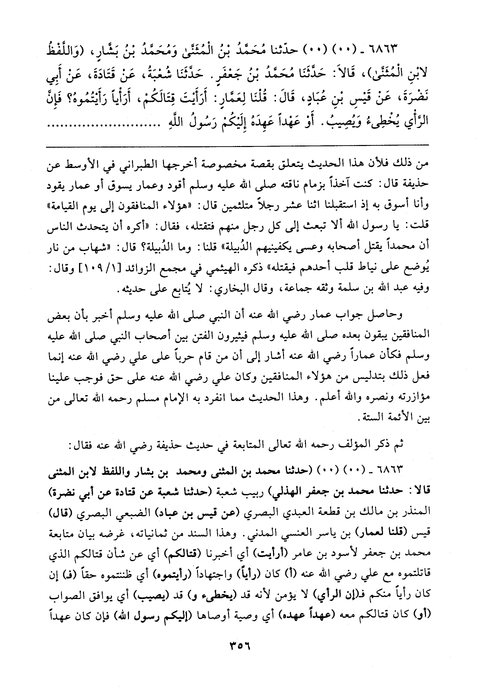 ٦٨٦٣ - (٠٠) (٠٠) (حدثنا محمد بن المثنى ومحمد بن بشار واللفظ لابن المثنى قالا: حدثنا محمد بن جعفر الهذلي) ربيب شعبة (حدثنا شعبة عن قتادة عن أبي نضرة) المنذر بن مالك بن قطعة العبدي البصري (عن قيس بن عباد) الضبعي البصري (قال) قيس (قلنا لعمار) بن ياسر العنسي المدني. وهذا السند من ثمانياته، غرضه بيان متابعة محمد بن جعفر لأسود بن عامر (أرأيت) أي أخبرنا (قتالكم) أي عن شأن قتالكم الذي قاتلتموه مع علي رضي الله عنه (أ) كان (رأيًا) واجتهادًا (رأيتموه) أي ظننتموه حقًا (فـ) إن كان رأيًا منكم فـ (إن الرأي) لا يؤمن لأنه قد (يخطئ و) قد (يصيب) أي يوافق الصواب (أو) كان قتالكم معه (عهدًا عهده) أي وصية أوصاها (إليكم رسول الله) فإن كان عهدًا