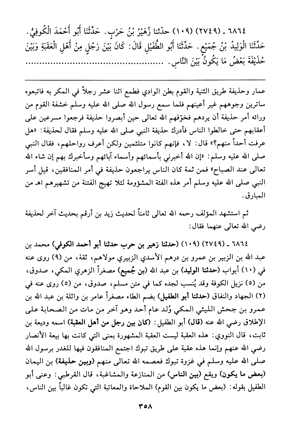 ٦٨٦٤ - (٢٧٤٩) (١٩٠) (حدثنا زهير بن حرب حدثنا أبو أحمد الكوفي) محمد بن عبد الله بن الزبير بن عمرو بن درهم الأسدي الزبيري مولاهم، ثقة، من (٩) روى عنه في (١٠) أبواب (حدثنا الوليد) بن عبد الله (بن جُميع) مصغرًا الزهري المكي، صدوق، من (٥) نزيل الكوفة وقد يُنسب لجده كما في متن مسلم، صدوق، من (٥) روى عنه في (٢) الجهاد والنفاق (حدثنا أبو الطفيل) بضم الطاء مصغرًا عامر بن واثلة بن عبد الله بن عمرو بن جحش الليثي المكي وُلد عام أحد وهو آخر من مات من الصحابة على الإطلاق رضي الله عنه (قال) أبو الطفيل: (كان بين رجل من أهل العقبة) اسمه وديعة بن ثابت، قال النووي: هذه العقبة ليست العقبة المشهورة بمنى التي كانت بها بيعة الأنصار رضي الله عنهم وإنما هذه عقبة على طريق تبوك اجتمع المنافقون فيها للغدر برسول الله صلى الله عليه وسلم في غزوة تبوك فعصمه الله تعالى منهم (وبين حذيفة) بن اليمان (بعض ما يكون) ويقع (بين الناس) من المنازعة والمشاغبة، قال القرطبي: وعنى أبو الطفيل بقوله: (بعض ما يكون بين القوم) الملاحاة والمعاتبة التي تكون غالبًا بين الناس،
