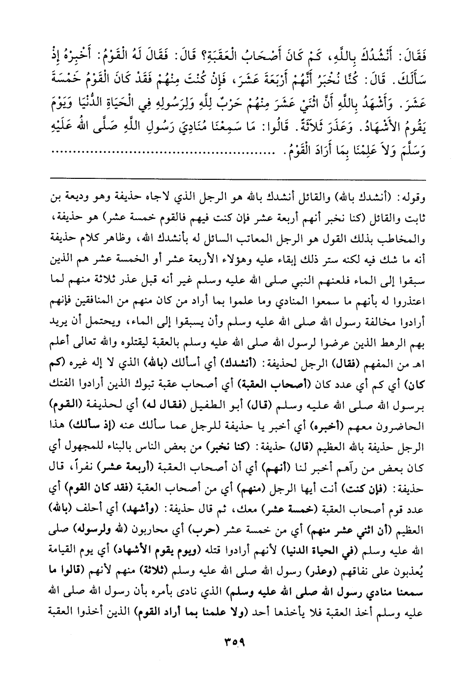وقوله: (أنشدك بالله) والقائل أنشدك بالله هو الرجل الذي لاجاه حذيفة وهو وديعة بن ثابت والقائل (كنا نخبر أنهم أربعة عشر فإن كنت فيهم فالقوم خمسة عشر) هو حذيفة، والمخاطب بذلك القول هو الرجل المعاتب السائل له بأنشدك الله، وظاهر كلام حذيفة أنه ما شك فيه لكنه ستر ذلك إبقاء عليه وهؤلاء الأربعة عشر أو الخمسة عشر هم الذين سبقوا إلى الماء فلعنهم النبي صلى الله عليه وسلم غير أنه قبل عذر ثلاثة منهم لما اعتذروا له بأنهم ما سمعوا المنادي وما علموا بما أراد من كان منهم من المنافقين فإنهم أرادوا مخالفة رسول الله صلى الله عليه وسلم وأن يسبقوا إلى الماء، ويحتمل أن يريد بهم الرهط الذين عرضوا لرسول الله صلى الله عليه وسلم بالعقبة ليقتلوه والله تعالى أعلم اه من المفهم (فقال) الرجل لحذيفة: (أنشدك) أي أسألك (بالله) الذي لا إله غيره (كم كان) أي كم أي عدد كان (أصحاب العقبة) أي أصحاب عقبة تبوك الذين أرادوا الفتك برسول الله صلى الله عليه وسلم (قال) أبو الطفيل (فقال له) أي لحذيفة (القوم) الحاضرون معهم (أخبره) أي أخبر يا حذيفة للرجل عما سألك عنه (إذ سألك) هذا الرجل حذيفة بالله العظيم (قال) حذيفة: (كنا نخبر) من بعض الناس بالبناء للمجهول أي كان بعض من رآهم أخبر لنا (أنهم) أي أن أصحاب العقبة (أربعة عشر) نفرًا، قال حذيفة: (فإن كنت) أنت أيها الرجل (منهم) أي من أصحاب العقبة (فقد كان القوم) أي عدد قوم أصحاب العقبة (خمسة عشر) معك، ثم قال حذيفة: (وأشهد) أي أحلف (بالله) العظيم (أن اثني عشر منهم) أي من خمسة عشر (حرب) أي محاربون (لله ولرسوله) صلى الله عليه وسلم (في الحياة الدنيا) لأنهم أرادوا قتله (ويوم يقوم الأشهاد) أي يوم القيامة يُعذبون على نفاقهم (وعذر) رسول الله صلى الله عليه وسلم (ثلاثة) منهم لأنهم (قالوا ما سمعنا منادي رسول الله صلى الله عليه وسلم) الذي نادى بأمره بأن رسول الله صلى الله عليه وسلم أخذ العقبة فلا يأخذها أحد (ولا علمنا بما أراد القوم) الذين أخذوا العقبة