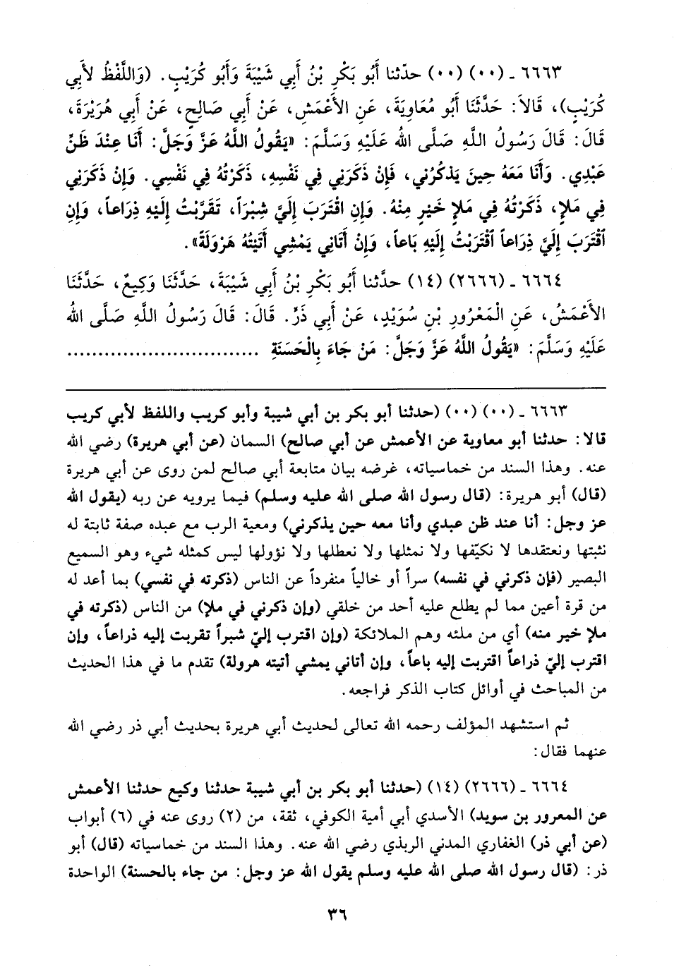 ٦٦٦٤ - (٢٦٦٦) (١٤) حدَّثنا أَبُو بَكْرٍ بْنُ أَبِي شَيْبَةَ، حَدَّثَنَا وَكِيعٌ، حَدَّثَنَا الأَعْمَشُ، عَنِ الْمَعْرُورِ بْنِ سُوَيْدٍ، عَنْ أَبِي ذَرٍّ. قَالَ: قَالَ رَسُولُ اللهِ صَلَّى اللَّه عَلَيْهِ وَسَلَّمَ: "يَقُولُ اللَّهُ عَزَّ وَجَلَّ: مَنْ جَاءَ بِالْحَسَنَةِ