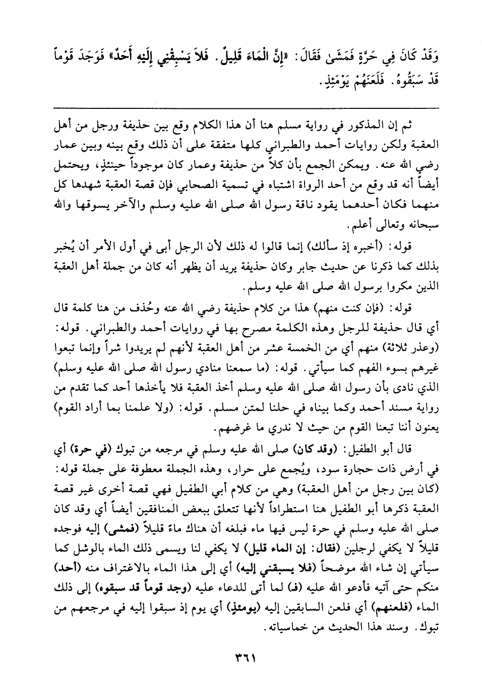 قال أبو الطفيل: (وقد كان) صلى الله عليه وسلم في مرجعه من تبوك (في حرة) أي في أرض ذات حجارة سود، ويُجمع على حرار، وهذه الجملة معطوفة على جملة قوله: (كان بين رجل من أهل العقبة) وهي من كلام أبي الطفيل فهي قصة أخرى غير قصة العقبة ذكرها أبو الطفيل هنا استطرادًا لأنها تتعلق ببعض المنافقين أيضًا أي وقد كان صلى الله عليه وسلم في حرة ليس فيها ماء فبلغه أن هناك ماءً قليلًا (فمشى) إليه فوجده قليلًا لا يكفي لرجلين (فقال: إن الماء قليل) لا يكفي لنا ويسمى ذلك الماء بالوشل كما سيأتي إن شاء الله موضحًا (فلا يسبقني إليه) أي إلى هذا الماء بالاغتراف منه (أحد) منكم حتى آتيه فأدعو الله عليه (فـ) لما أتى للدعاء عليه (وجد قومًا قد سبقوه) إلى ذلك الماء (فلعنهم) أي فلعن السابقين إليه (يومئذٍ) أي يوم إذ سبقوا إليه في مرجعهم من تبوك. وسند هذا الحديث من خماسياته.