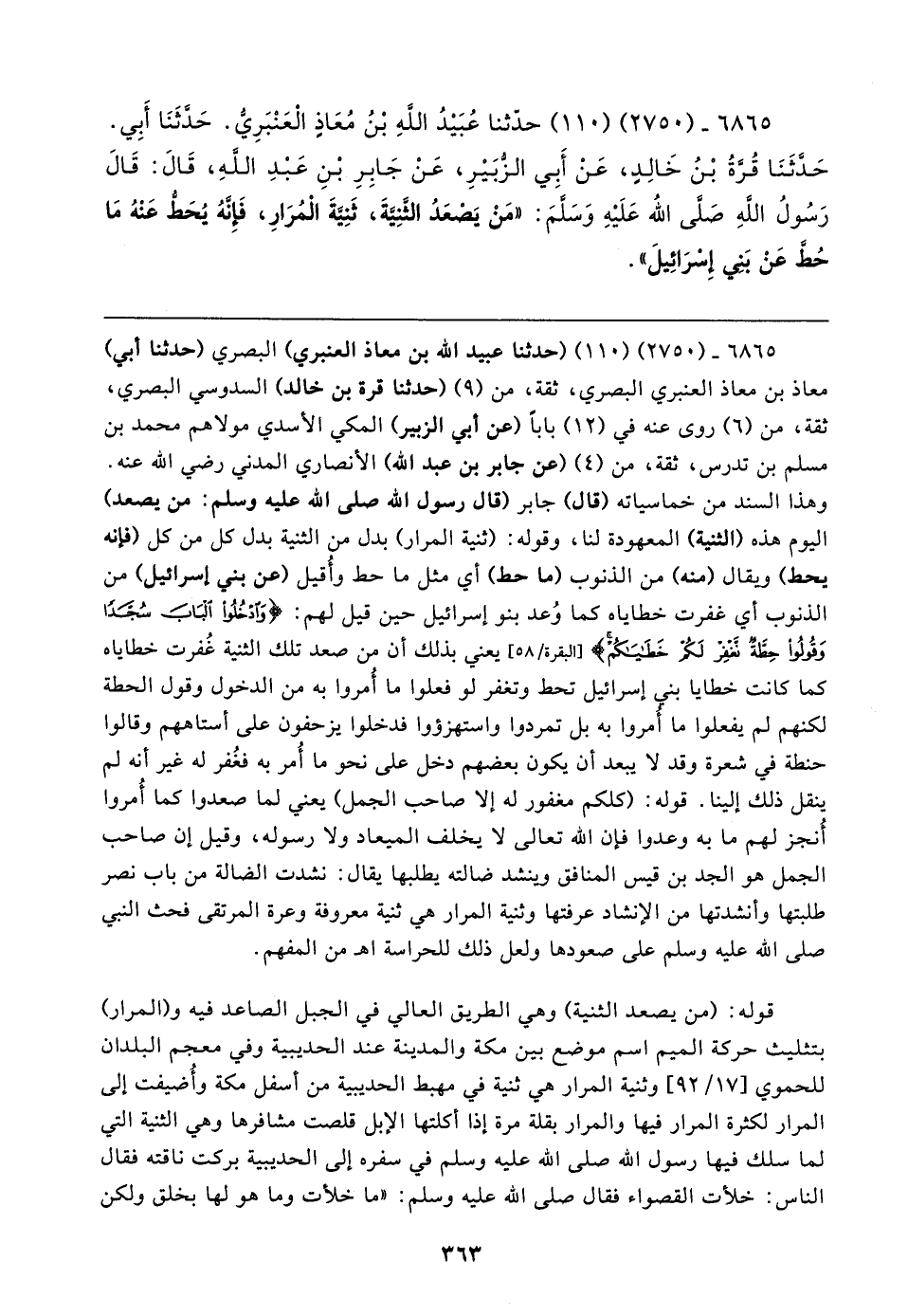 ٦٨٦٥ - (٢٧٥٠) (١١٠) حدّثنا عُبَيْدُ اللهِ بْنُ مُعَاذٍ الْعَنْبَرِيُّ. حَدَّثَنَا أَبِي. حَدَّثَنَا قُرَّةُ بْنُ خَالِدٍ، عَنْ أَبي الزُّبَيْرِ، عَنْ جَابِرِ بْنِ عَبْدِ اللهِ، قَالَ: قَالَ رَسُولُ اللهِ - صلى الله عليه وسلم -: "مَنْ يَصْعَدُ الثَّنِيَّةَ، ثَنِيَّةَ الْمُرَارِ، فَإنَّهُ يُحَطُّ عَنْهُ مَا حُطَّ عَنْ بَني إِسْرَائِيلَ"