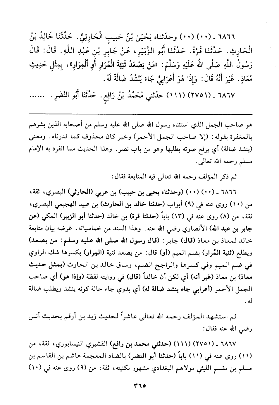 ٦٨٦٦ - (٠٠) (٠٠) (وحدثناه يحيى بن حبيب) بن عربي (الحارثي) البصري، ثقة، من (١٠) روى عنه في (٩) أبواب (حدثنا خالد بن الحارث) بن عبيد الهجيمي البصري، ثقة، من (٨) روى عنه في (١٣) بابًا (حدثنا قرة) بن خالد (حدثنا أبو الزبير) المكي (عن جابر بن عبد الله) الأنصاري رضي الله عنه. وهذا السند من خماسياته، غرضه بيان متابعة خالد لمعاذ بن معاذ (قال) جابر: (قال رسول الله صلى الله عليه وسلم: من يصعد) ويطلع (ثنية المُرار) بضم الميم (أو) قال: من يصعد ثنية (المِرار) بكسرها شك الراوي في ضم الميم وفي كسرها والراجح الضم، وساق خالد بن الحارث (بمثل حديث معاذ) بن معاذ (غير أنه) أي لكن أن خالدًا (قال) في روايته لفظة (وإذا هو) أي صاحب الجمل الأحمر (أعرابي جاء ينشد ضالة له) أي بدوي جاء حالة كونه ينشد ويطلب ضالة له.